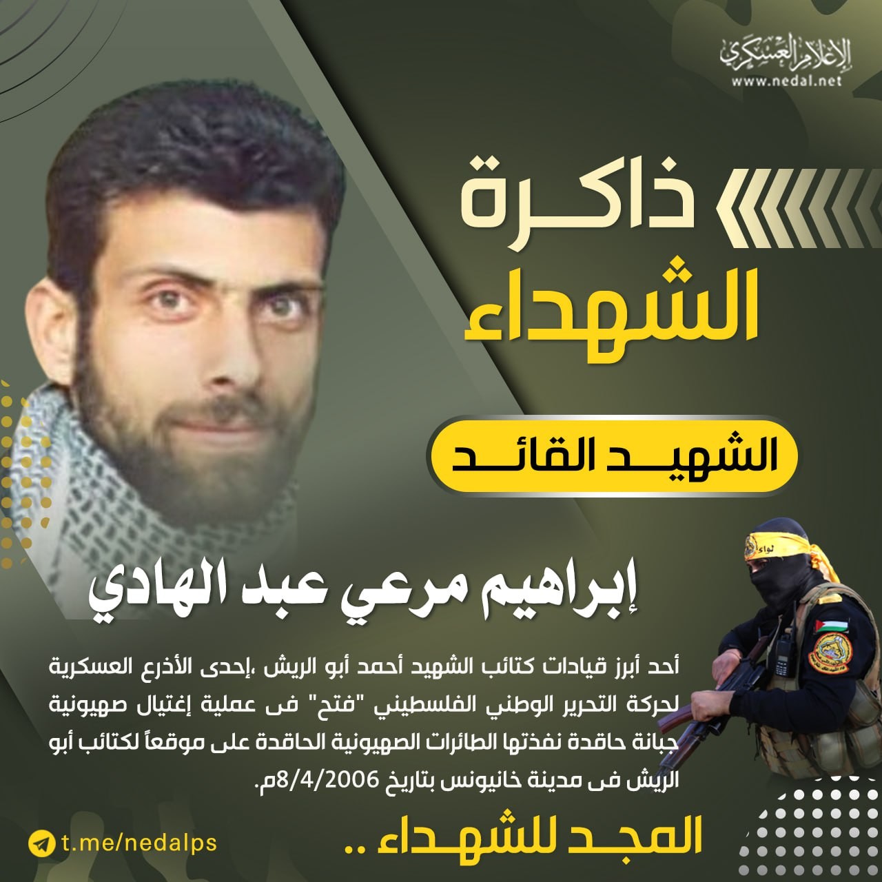 يصادف اليوم الثامن من شهر إبريل الذكرى السنوية لإستشهاد القائد " إبراهيم مرعى عبد الهادى " أحد أبرز قيادات كتائب الشهيد أحمد أبو الريش ،إحدى الأزرع العسكرية لحركة التحرير الوطنى الفلسطينى "فتح"، والذى إستشهد فى عملية إغتيال صهيونية جبانة حاقدة بتاريخ 8.4.2006م عندما قصفت الطائرات الصهيونية الحاقدة موقعاً لكتائب أبو الريش فى مدينة خانيونس.