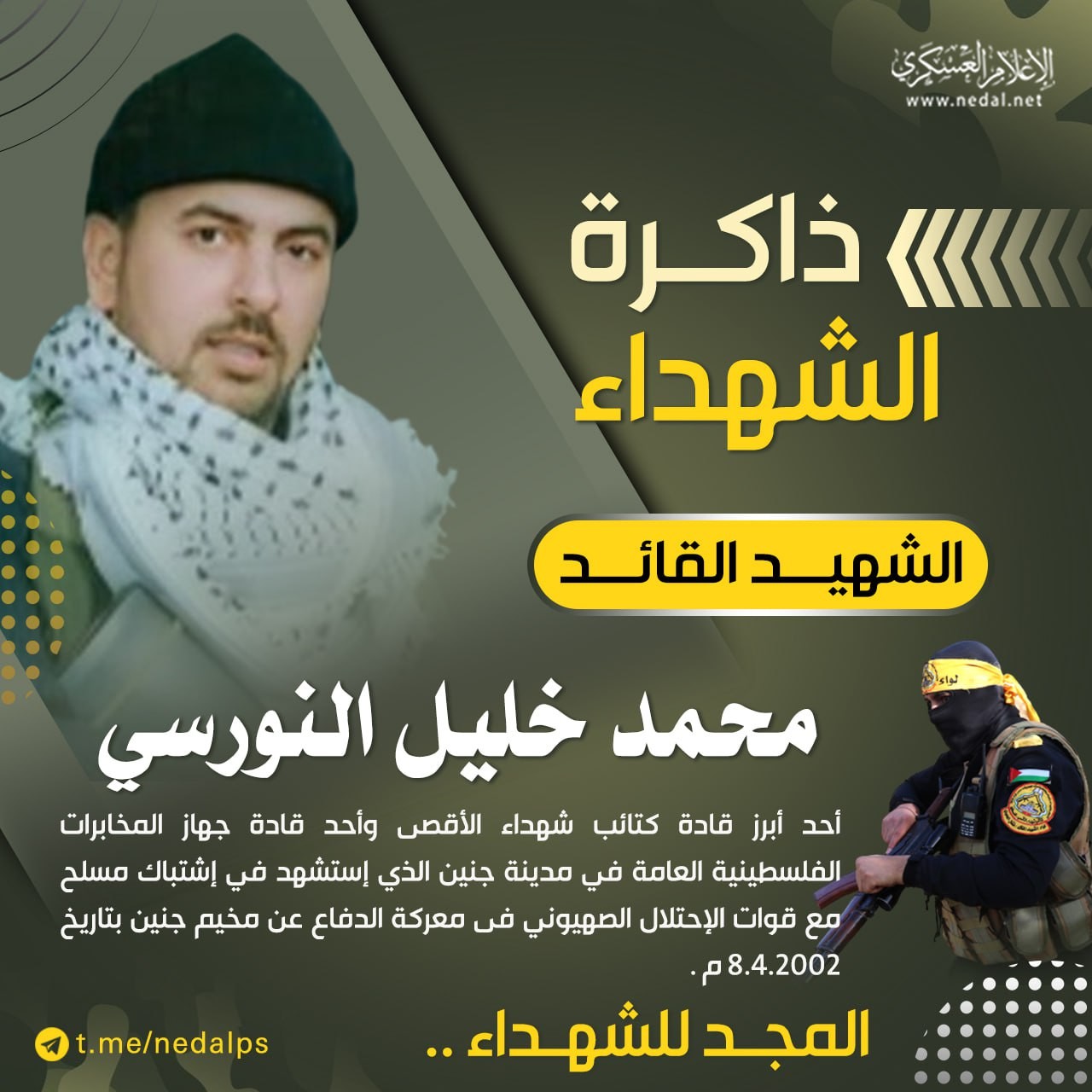 يصادف اليوم الثامن من شهر إبريل الذكرى السنوية لإستشهاد القائد المجاهد " محمد النورسي " أحد أبرز قادة " كتائب شهداء الأقصى " الذراع العسكري لحركة التحرير الوطنى الفلسطينى " فتح " وأحد قادة جهاز المخابرات الفلسطينية العامة فى مدينة جنين،وأحد قادة معركة الدفاع عن مخيم جنين ،والذى إستشهدا في إشتباك مسلح مع قوات الإحتلال الصهيونى فى معركة الدفاع عن مخيم جنين بتاريخ 8.4.2002 م .