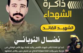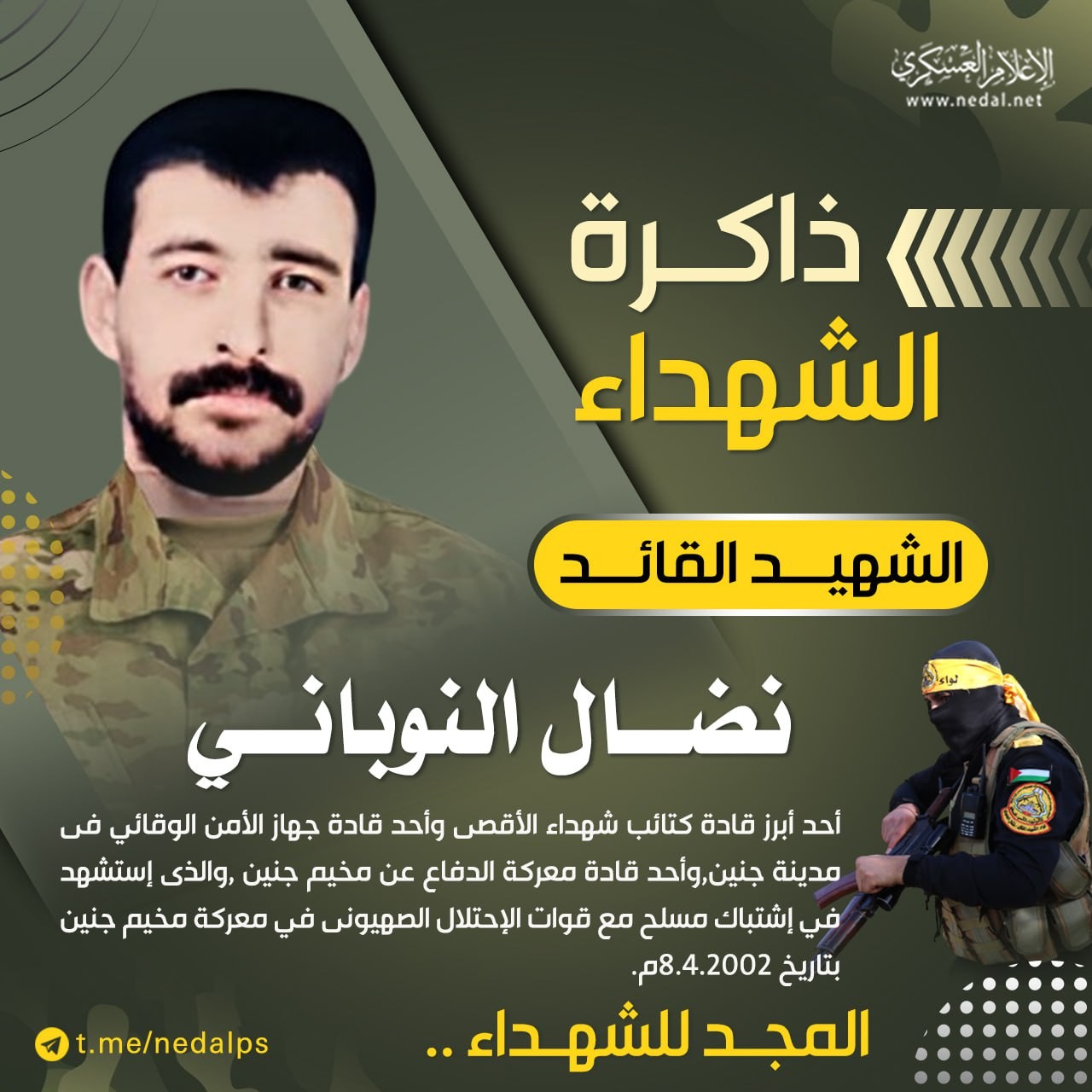 يصادف اليوم الثامن من شهر إبريل الذكرى السنوية لإستشهاد القائد المجاهد " نضال النوبانى " أحد أبرز قادة " كتائب شهداء الأقصى " الذراع العسكري لحركة التحرير الوطنى الفلسطينى " فتح " فى الضفة الغربية المحتلة ،وأحد قادة جهاز الأمن الوقائي فى مدينة جنين,وأحد قادة معركة الدفاع عن مخيم جنين ,والذى إستشهدا في إشتباك مسلح مع قوات الإحتلال الصهيونى فى معركة مخيم جنين بتاريخ 8.4.2002م.