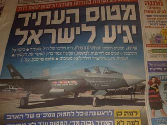 عنونت صحيفة "يديعوت أحرونوت" الصادرة صباح اليوم، الخميس، بعنوان إلى "الصفقة الأكبر في تاريخ ما يسمي بالأجهزة الأمنية الإسرائيلية تخرج إلى حيز التنفيذ"، وذلك في إشارة إلى ما أسمته "طائرة المستقبل"، طائرة "أف 35" الأكثر تطورا في العالم.