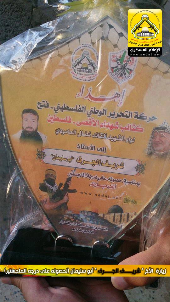 وتحدث الأخ : أبو رمضان ، بكلمة قدم فيها التهاني للأخ شريف لحصوله على هذه المرتبة العلمية مؤكداً أن الأوطان لا تسمو الا بالعلم ، متمنياً له أن يستمر في التقدم والنجاح لما فيه الصلاح لوطنه وشعبه ، حيث عبر الأخ شريف عن عظيم شكره لهذه الزيارة مؤكداً أن كتائب الأقصى كانت ولا زالت في طليعة العمل المقاوم ، وانتهت الزيارة بتسلمه درع الكتائب .