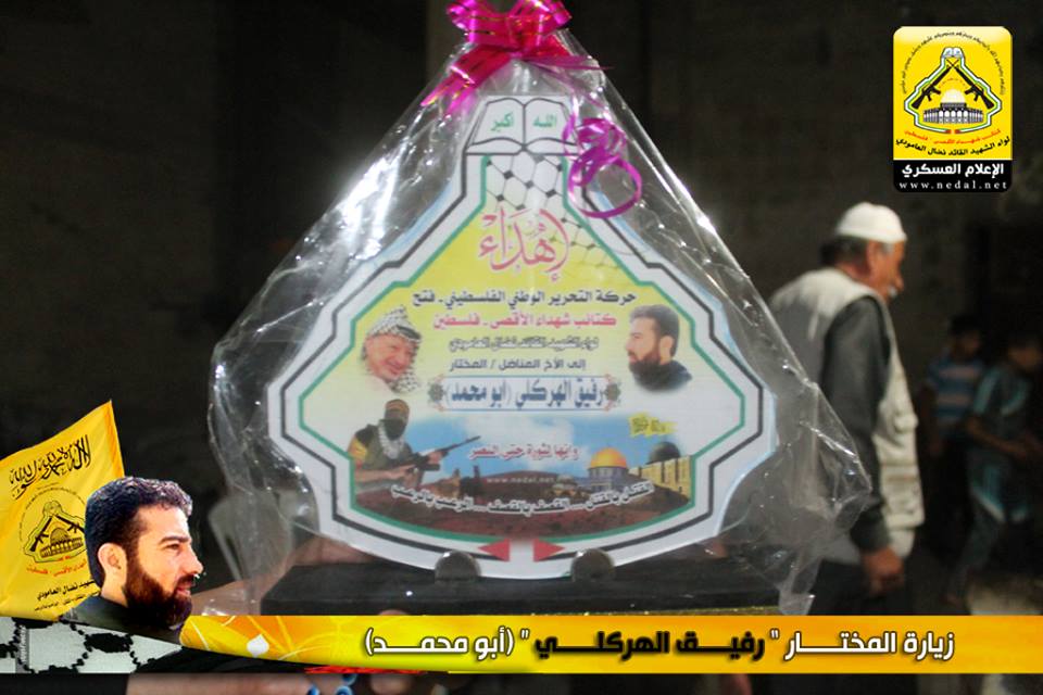 وأكد الأخ : أبو الأمل في كلمة الكتائب على أن فلسطين ستحرر بسواعد أبنائها المخلصين مؤكداً على الدور البارز للمختار الهركلي في خدمة وطنه وأبناء شعبه وعبر المختار عن عظيم شكره لهذه الزيارة مؤكداً أن كتائب الأقصى كانت ولا زالت في طليعة العمل المقاوم ، وانتهت الزيارة بتسلمه درع الكتائب .