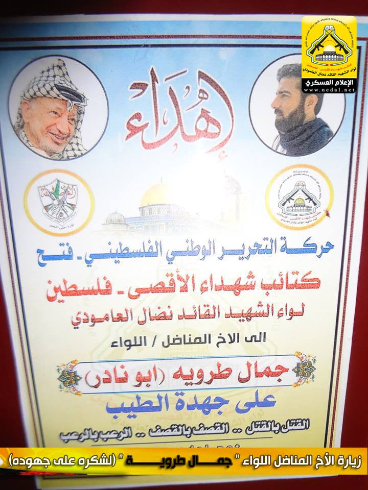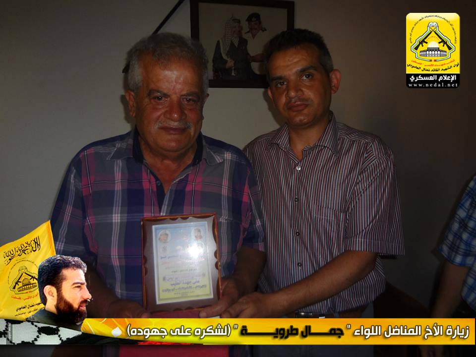 نمضي بثبات حاملين لأمانة الشهداء والجرحى والأسرى فعهدنا هو عهد الأوفياء ، فرجال الحق يُبصرون في ساحات الوغى ويُلقنون العدو فنون القتال ، كيف لا وهم من رحم هذا الشعب المعطاء الصامد على أرضه ،  فعزائمهم شامخة كشموخ جبال عيلبون ، ولأن الشعب الفلسطيني شعب مناضل معطاء فقد تقدم وفد من كتائب شهداء الأقصى - فلسطين "لواء الشهيد نضال العامودي" بزيارة لبيت الأخ المناضل اللواء : جمال طروية "أبو نادر" ، وذلك ضمن حملة الوفاء التي أطلقتها الكتائب وتقديراً لجهده الطيب.