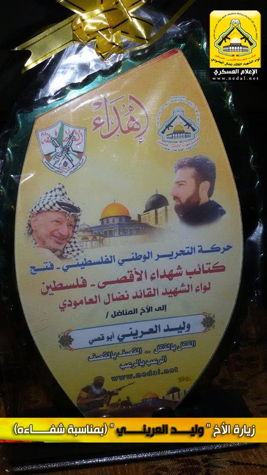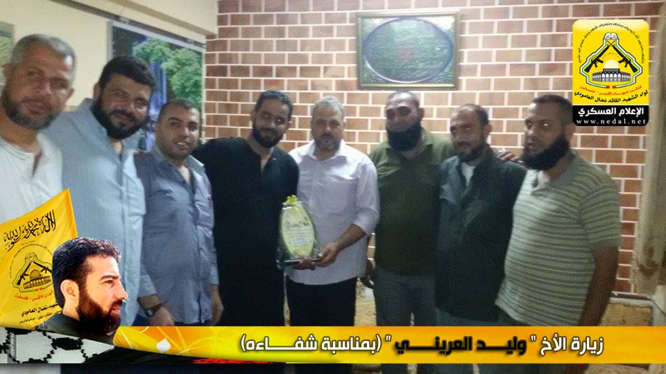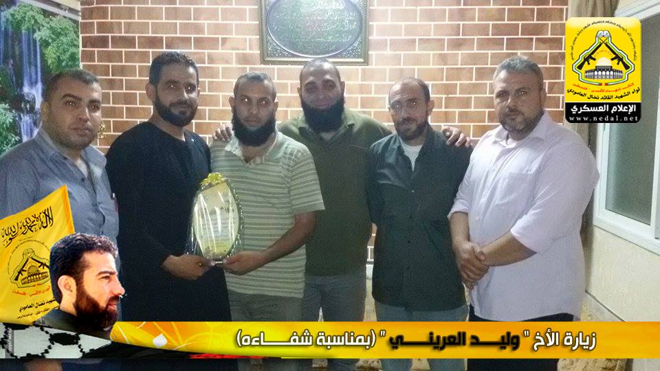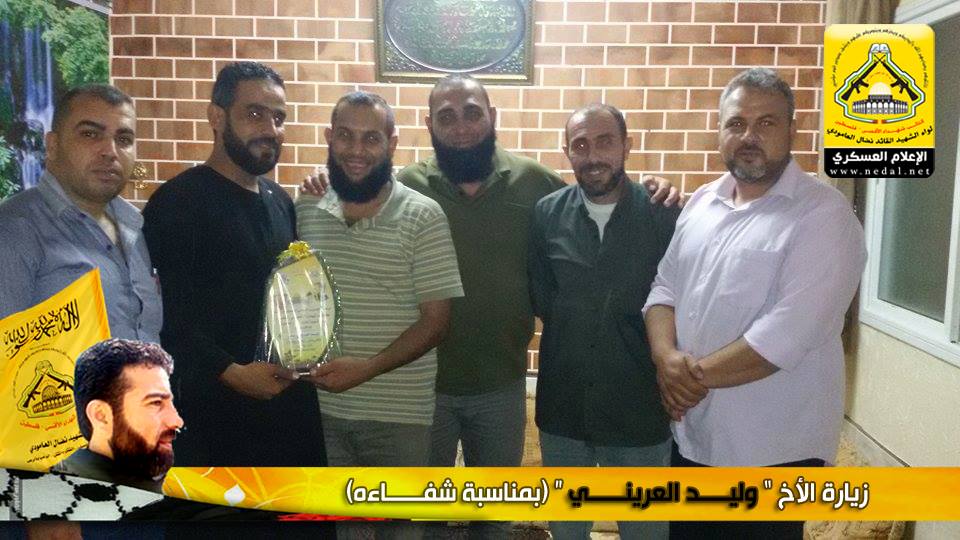 هو عهد الصادقين عهد الأوفياء قطعناه على أنفسنا ومضينا بثبات حاملين لهدف واحد هو تحرير فلسطين من بحرها الى نهرها ، وأعلناها مدوية وليسمعها الاحتلال جيداً نحن أصحاب الأرض وغاصبها الى زوال ، فليس منا وليس فينا من يفرط بشبر واحد من أرض فلسطين ، ولأن الشعب الفلسطيني شعب مناضل معطاء فقد تقدم وفد من كتائب شهداء الأقصى - فلسطين "لواء الشهيد نضال العامودي" بزيارة لبيت الأخ المناضل: وليد العريني ، وذلك لتهنئته بالسلامة بعد وعكة صحية ألمت به.