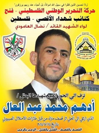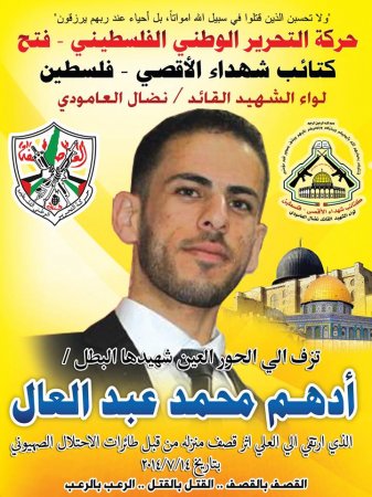 الذكرى السنوية الأولى لإستشهاد الشهيد المجاهد " أدهم محمد عبدالعال " و الذى ارتقى شهيداً بعد دكه المغتصابات الصهيونىة بعشرات الصواريخ المباركة خلال معركة " طريق العاصفة " لصد العدوان الصهيونى الغاشم عن شعبنا الفلسطينى فى قطاع غزة يوم الاثنين الموافق 14 / 7 / 2014م .