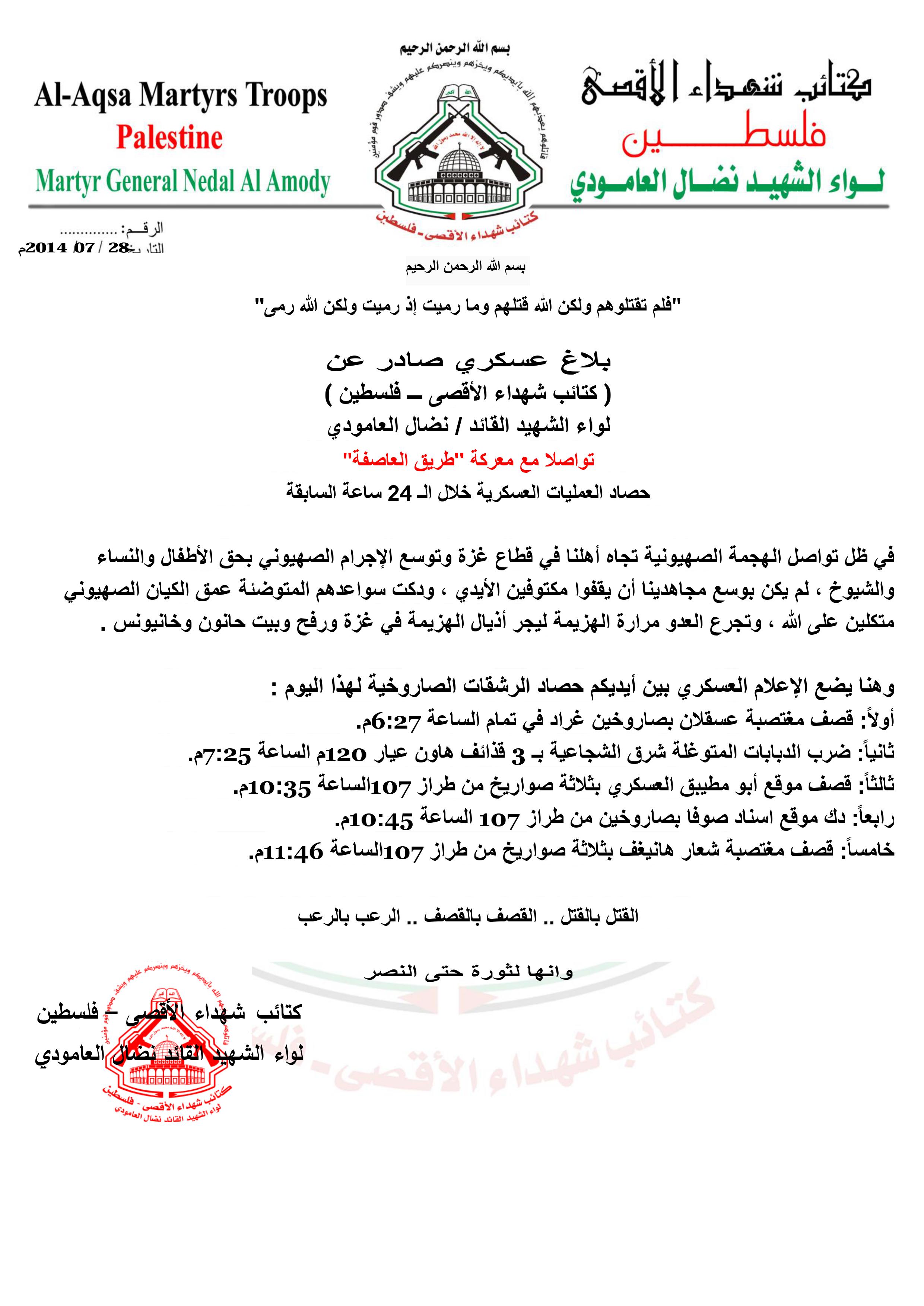في ظل تواصل الهجمة الصهيونية تجاه أهلنا في قطاع غزة وتوسع الإجرام الصهيوني بحق الأطفال والنساء والشيوخ ، لم يكن بوسع مجاهدينا أن يقفوا مكتوفين الأيدي ، ودكت سواعدهم المتوضئة عمق الكيان الصهيوني متكلين على الله ، وتجرع العدو مرارة الهزيمة ليجر أذيال الهزيمة في غزة ورفح وبيت حانون وخانيونس .