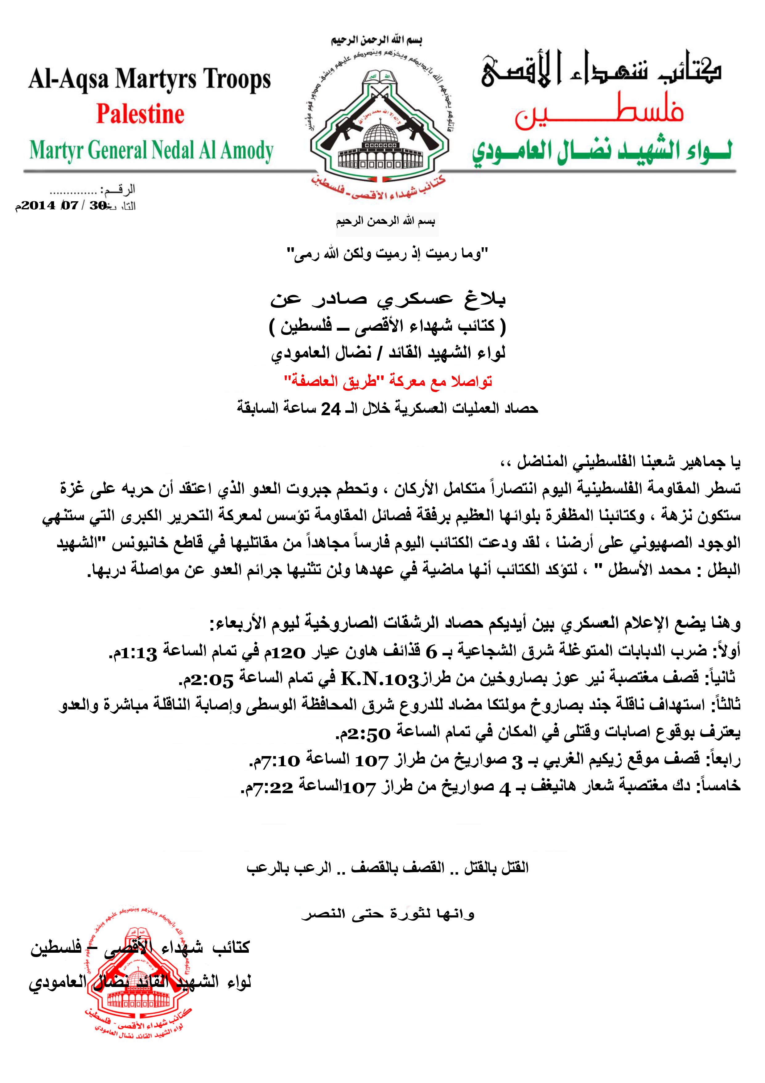 أولاً: ضرب الدبابات المتوغلة شرق الشجاعية بـ 6 قذائف هاون عيار 120م في تمام الساعة 1:13م.