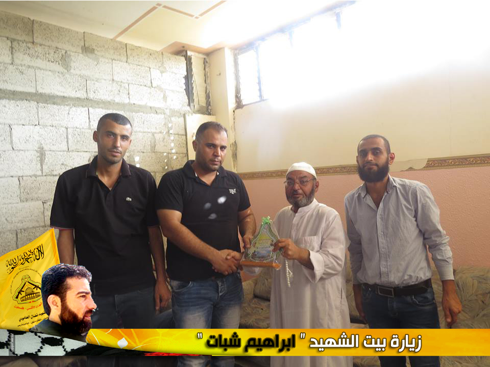 نمضي بثبات حاملين لأمانة الشهداء والجرحى والأسرى فعهدنا هو عهد الأوفياء ، فرجال الحق يُبصرون في ساحات الوغى ويُلقنون العدو فنون القتال ، كيف لا وهم من رحم هذا الشعب المعطاء الصامد على أرضه ،  فعزائمهم شامخة كشموخ جبال عيلبون ، ولأن الشعب الفلسطيني شعب مناضل معطاء فقد تقدم وفد من كتائب شهداء الأقصى - فلسطين "لواء الشهيد نضال العامودي" بزيارة لبيت الشهيد :ابراهيم شبات.