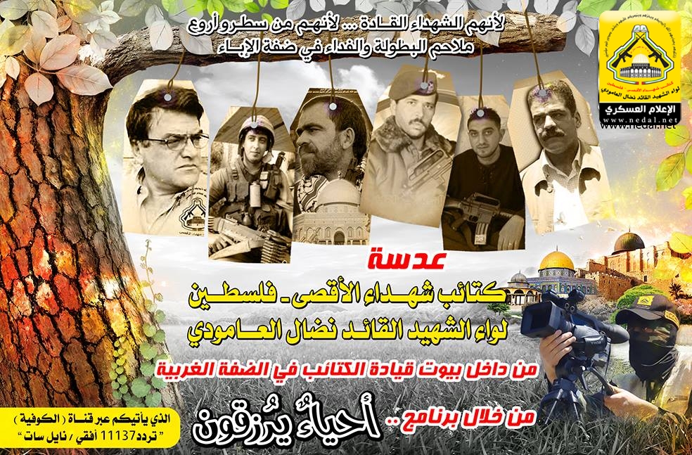 أعلن الإعلام العسكري لكتائب شهداء الأقصى - فلسطين "لواء الشهيد القائد نضال العامودي" عن امتداد برنامج "أحياء يرزقون" لشهداء وقادة كتائب الأقصى في الضفة الغربية .