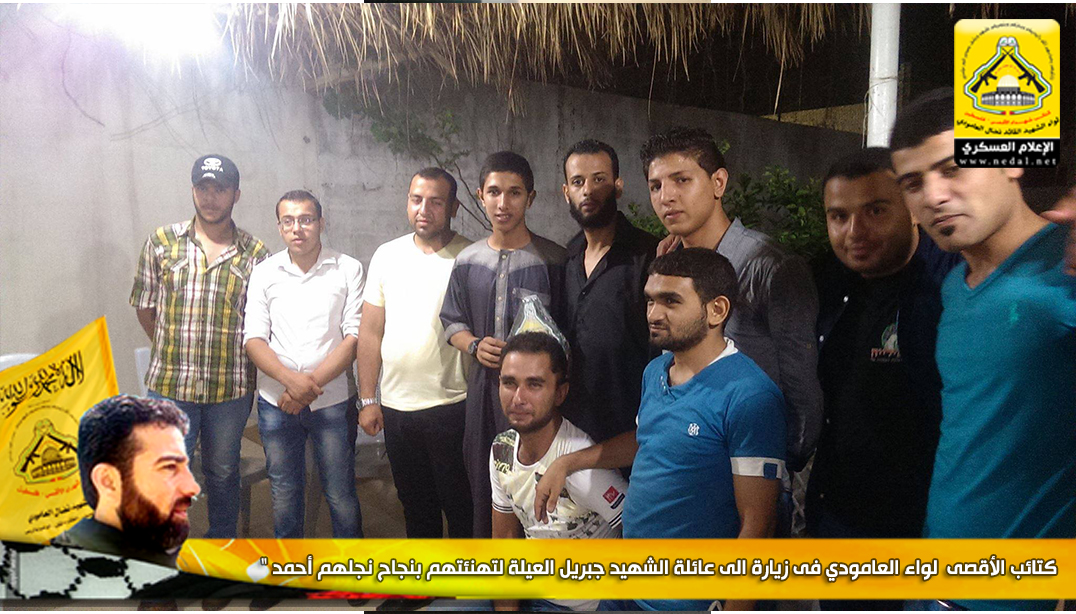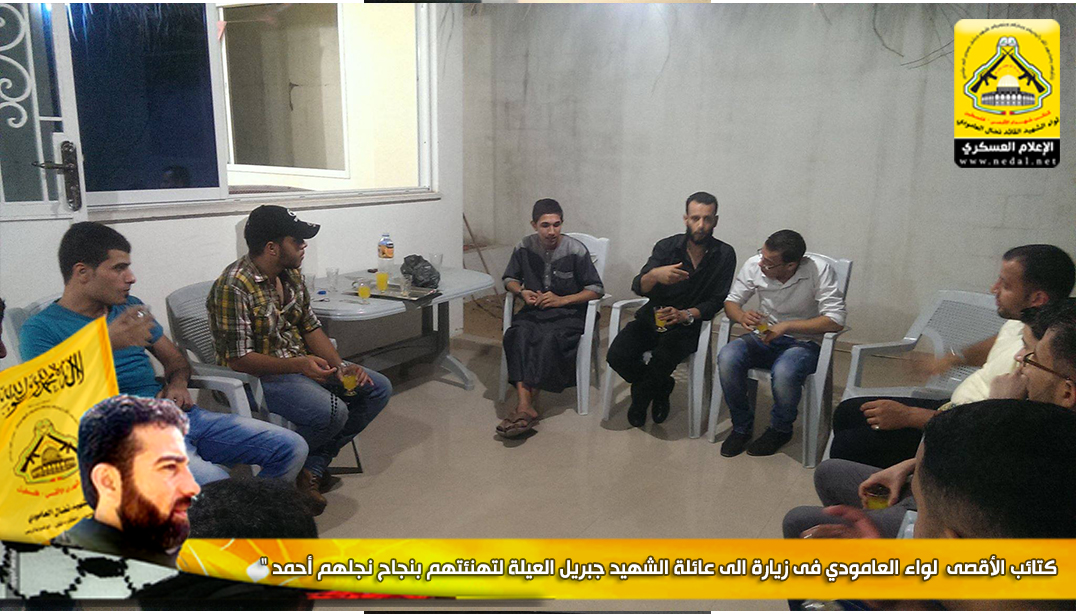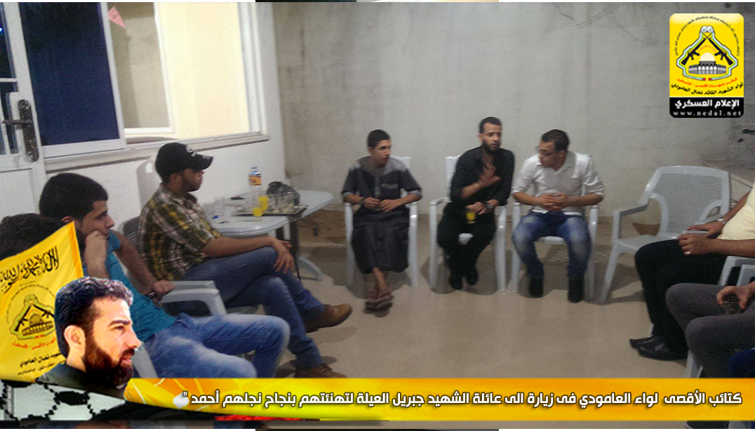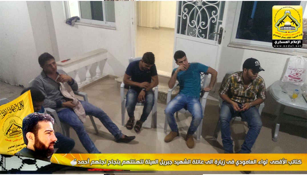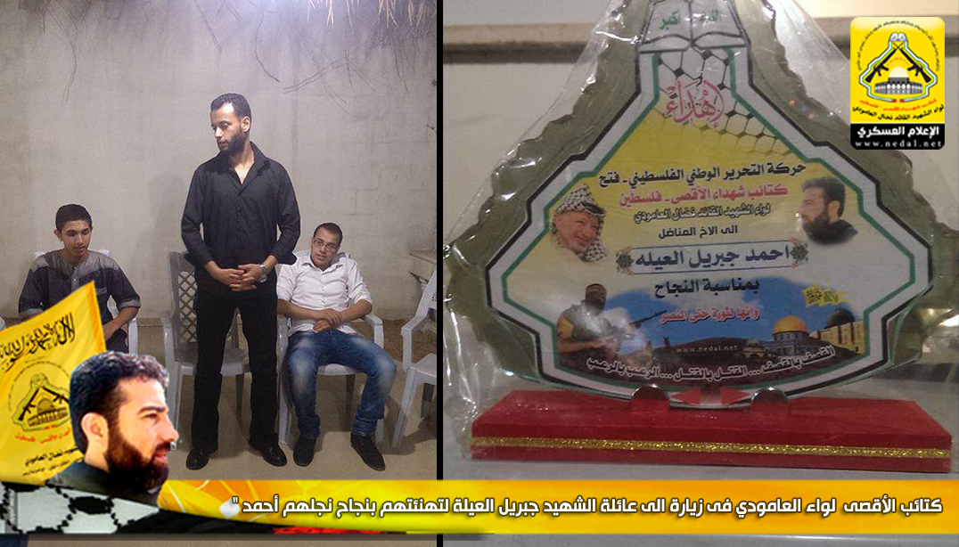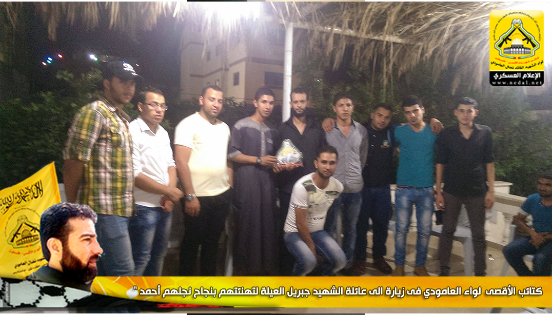 نمضي بثبات حاملين لأمانة الشهداء والجرحى والأسرى فعهدنا هو عهد الأوفياء ، فرجال الحق يُبصرون في ساحات الوغى ويُلقنون العدو فنون القتال ، كيف لا وهم من رحم هذا الشعب المعطاء الصامد على أرضه ،  فعزائمهم شامخة كشموخ جبال عيلبون ، ولأن الشعب الفلسطيني شعب مناضل معطاء فقد تقدم وفد من كتائب شهداء الأقصى - فلسطين "لواء الشهيد نضال العامودي" بزيارة لعائلة الشهيد :جبريل العيلة ، لتهنئتهم بنجاح نجلهم أحمد.