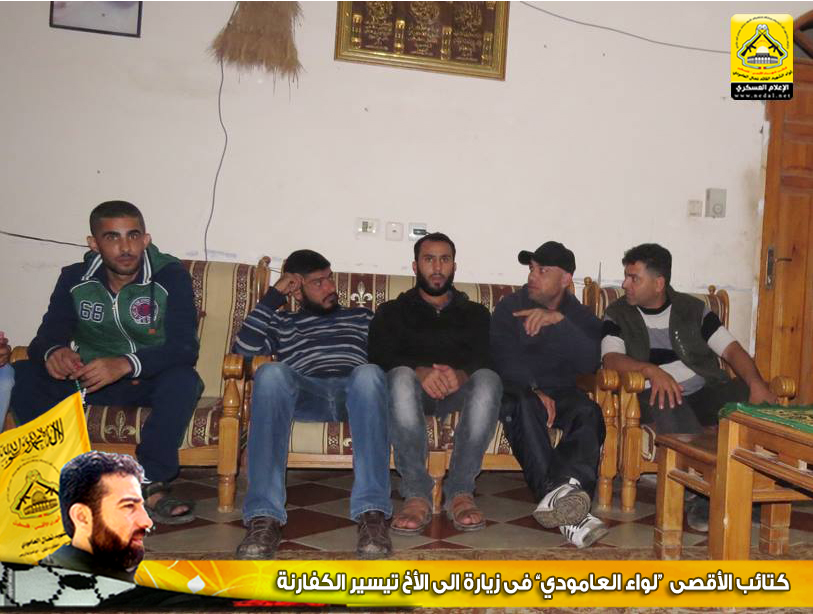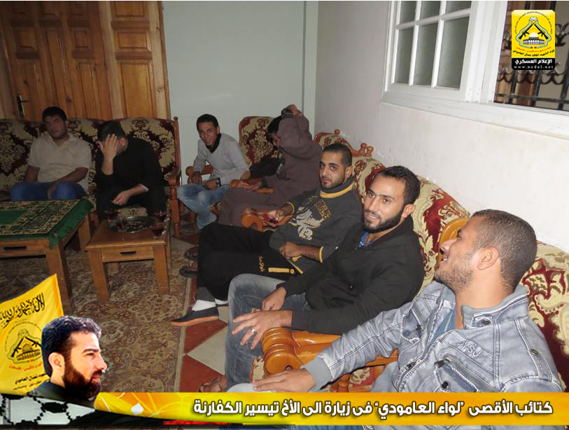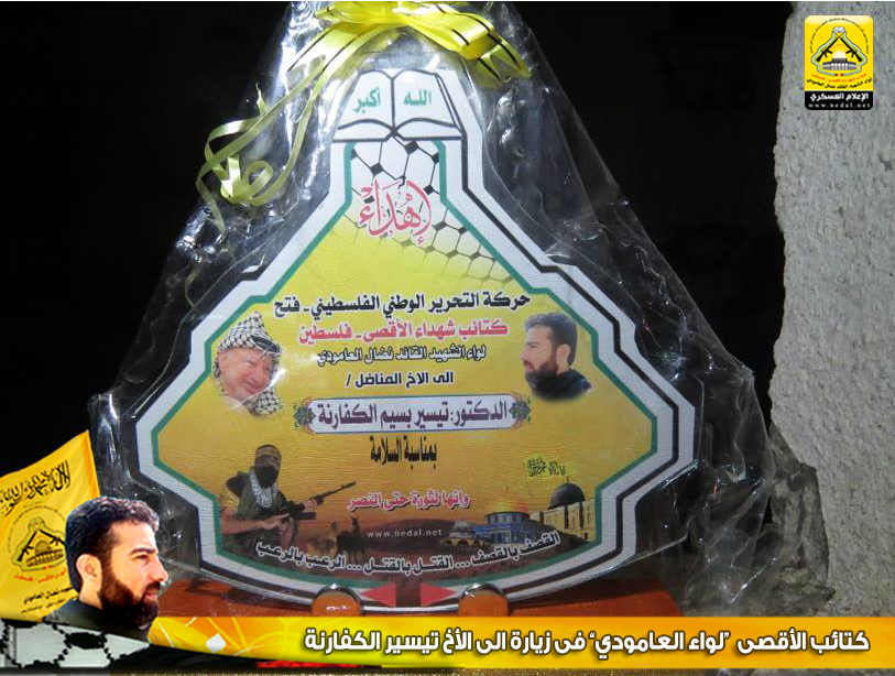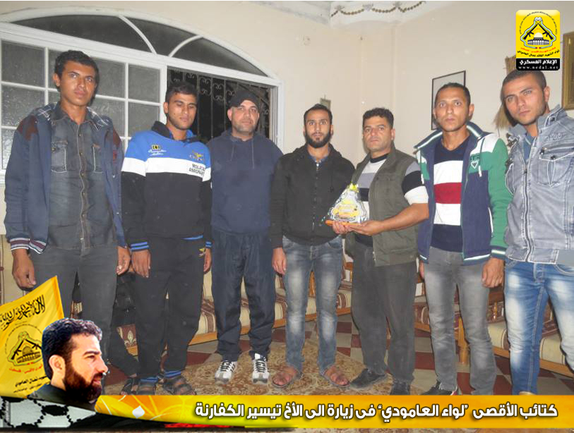 وتقدم الأخ : أبو محمد ، في كلمة الكتائب بالتهنئة من الأخ تيسير بمناسبة زفافه شفاءه وخروجه من المستشفى سالماً معافاً، وعبر الأخ تيسير عن عظيم شكره لهذه الزيارة مؤكداً أن كتائب الأقصى "لواء العامودي" وكانت ولا زالت في الصدارة وفي طليعة العمل المقاوم، وفي نهاية اللقاء تسلم الأخ تيسير الكفارنة درع الكتائب.