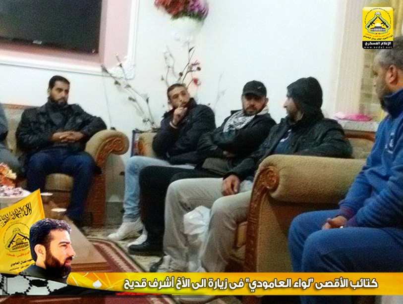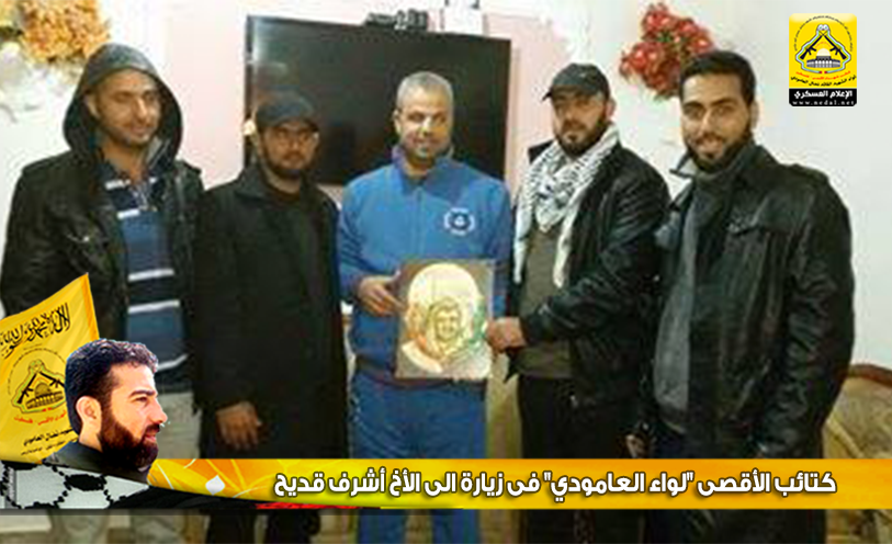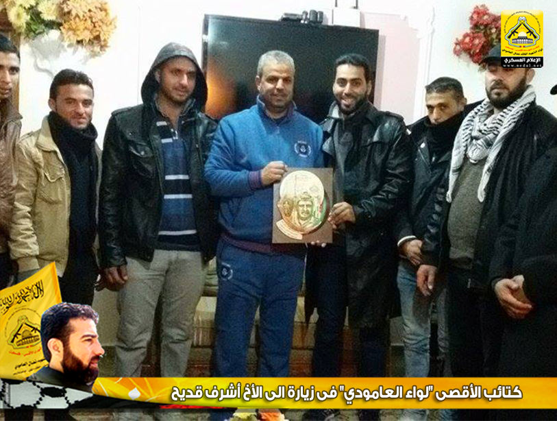 وتقدم الأخ : أبو محمد ، في كلمة الكتائب بالتحية للأخ أشرف ، مؤكداً على عطاءه اللامحدود في خدمة وطنه وحركته ، من جانبه عبر الأخ أشرف قديح عن شكره للوفد الزائر ، مؤكداً أن كتائب الأقصى "لواء العامودي" وكانت ولا زالت في الصدارة وفي طليعة العمل المقاوم، وفي نهاية اللقاء تسلم الأخ أشرف درع الكتائب.