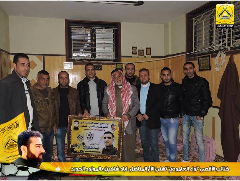 بجنود العز سندحر المحتل عن أرض الوطن ، رغم الجراح ، ورغم الألم ، سنمضي لجانب شعبنا نرفع عنه الظلم والأسى نقترب منه في كافة مناسباته ، بلواء نضال العامودي سيندحر المحتل وسنعيد للوطن مجده ولشعبنا حقه وللشهداء ثأرهم ، فاليوم قد توجه وفد من كتائب شهداء الأقصى - فلسطين "لواء الشهيد نضال العامودي" بزيارة لبيت الأخ المناضل : إياد شاهين ، لتهنئته بالمولود الجديد "محمود" بعد انتظار دام 15 عاماً.