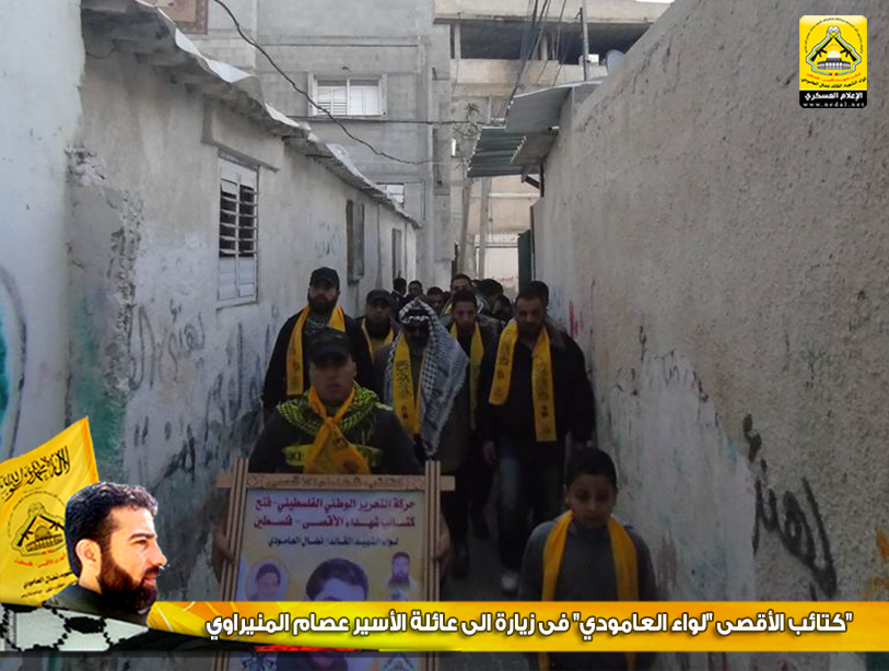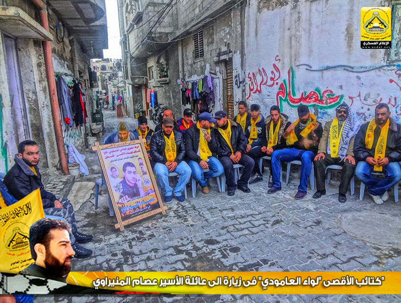 أسرانا يا تاج الفَخَار و يا فخَر الأمة ، يا من قهرتم العدو بصمودكم ويا من ضحيتم بكل ما تملكون وأفنيتم زهرة شبابكم ، يا أمجاد أمتنا و يا رمز كرامتنا و يا من أسقيتمونا كأس العزة ، أسرانا نرفع هاماتنا أمام ثباتكم ، لا ولن ننساكم وعهدنا تحريركم ولن يطول الليل فالفجر قريب ، ولأنهم الأسود في عرينهم والشامخون في زنازين العدو فقد توجه وفد من كتائب شهداء الأقصى - فلسطين (لواء الشهيد القائد / نضال العامودي) بزيارة لبيت الأسير : عصام المنيراوي.
