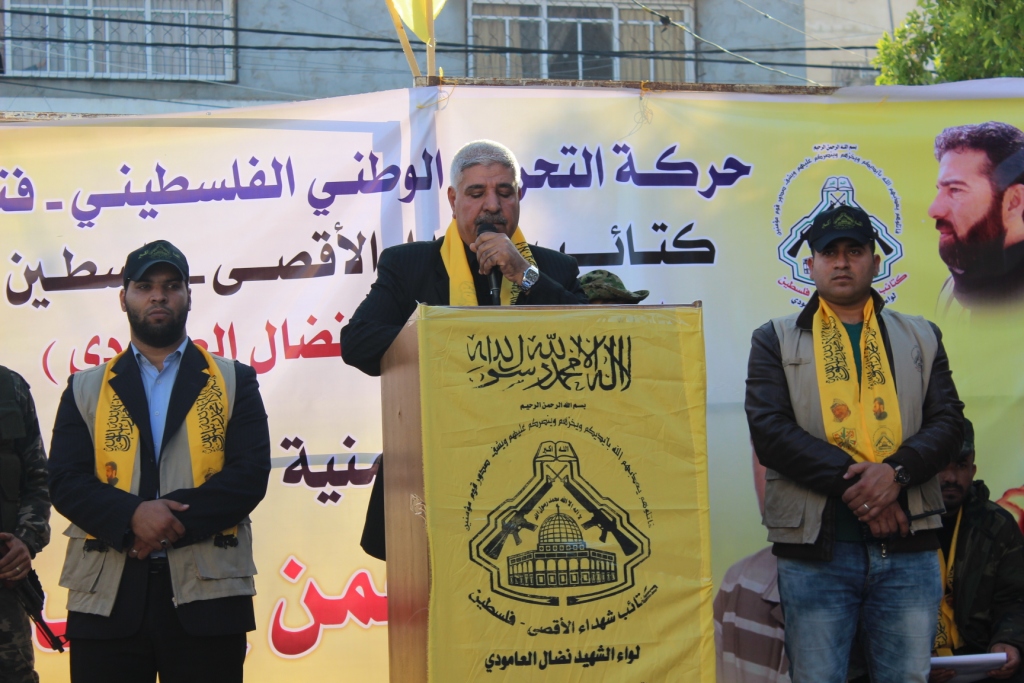وفي كلمة موفق حميد، مدير جمعية حسام للأسرى والمحررين، أكد على نضال وتضحيات الأسير وقامته النضالية وتضحياته الكبيرة من أجل وطنه وكفاح شعبه المشروع، مؤكداُ على أن هذا الفداء والتضحية قد أسس للأجيال تاريخ حافل بالكفاح، وأن حركة فتح التي قدمت الشهداء والجرحى والأسرى على مذبح الحرية لن تسقط الكفاح من قاموسها، وهي تجسده اليوم بكتائب الأقصى لواء نضال العامودي، مقدماً التحية للأسير مروان البرغوثي المرشح لجائزة نوبل للسلام.