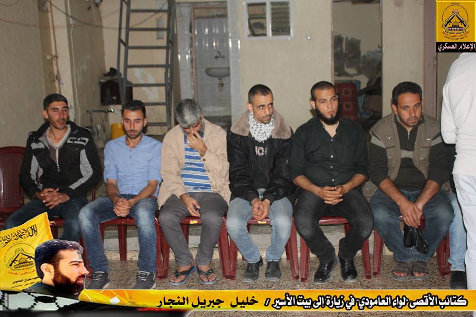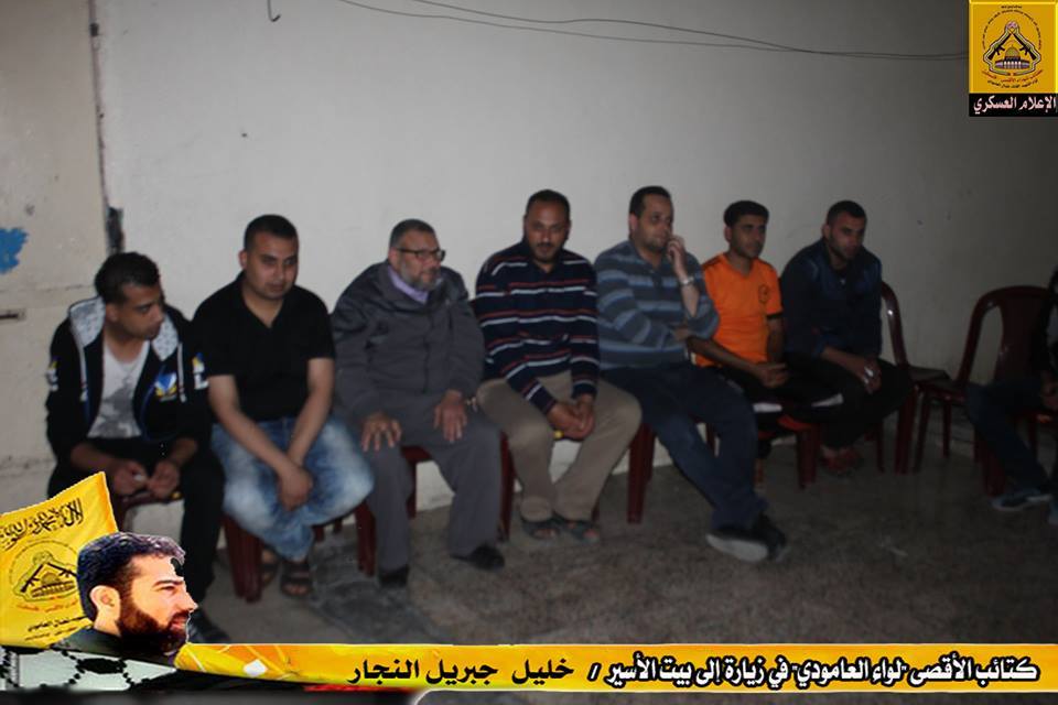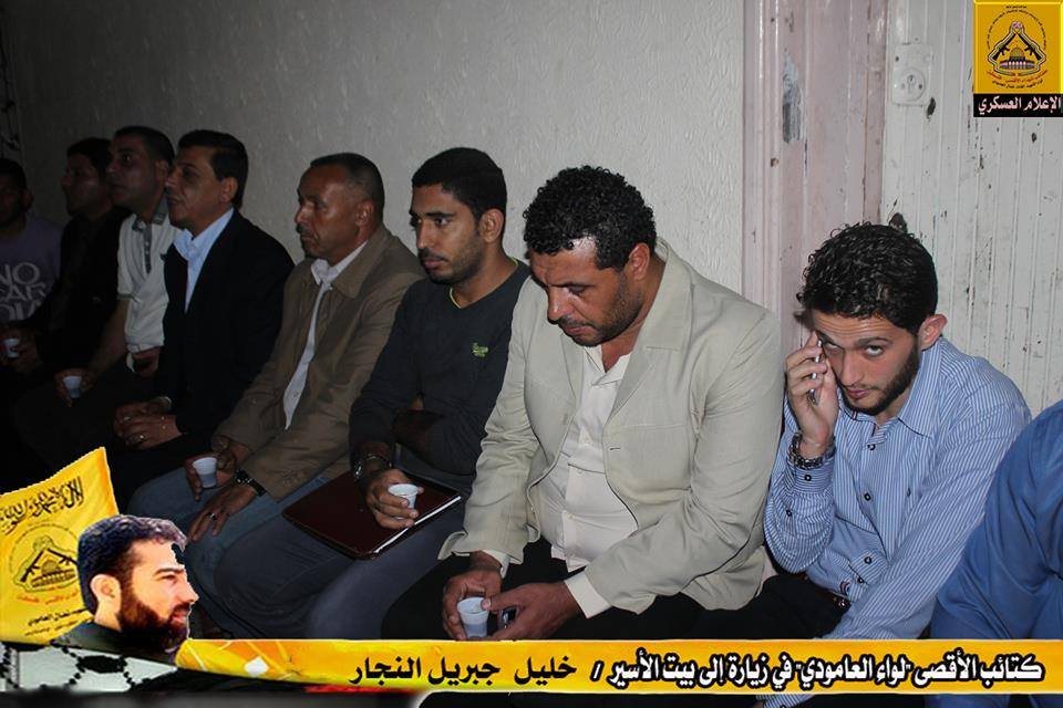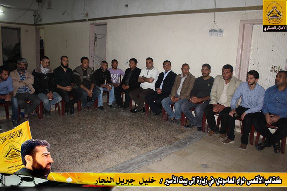 حيث ألقى الأخ : أبو عمر، كلمة بإسم الكتائب أكد من خلالها أن لواء العامودي وبرفقة كافة الفصائل يُعد العدة لمعركة التحرير وتبييض السجون الصهيونية مشدداً أن الكتائب ستفرج عن أسراها البواسل بالطريقة التي يفهما العدو، بدورها شكرت عائلة الأسير خليل النجار الوفد المتقدم لبيته على هذه الزياة الطيبة مشددةً على ضرورة إخلاء سراح جميع الأسرى باللغة التي يفهمها العدو وتسلمت العائلة صورة مهداه من الكتائب تعبيراً عن وفاءها الكتائب لأحرار شعبها وأبطاله .