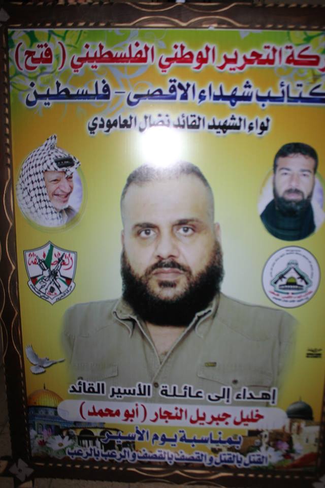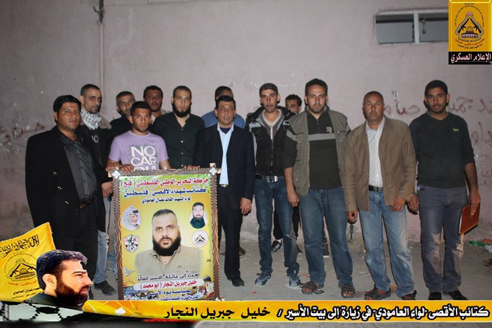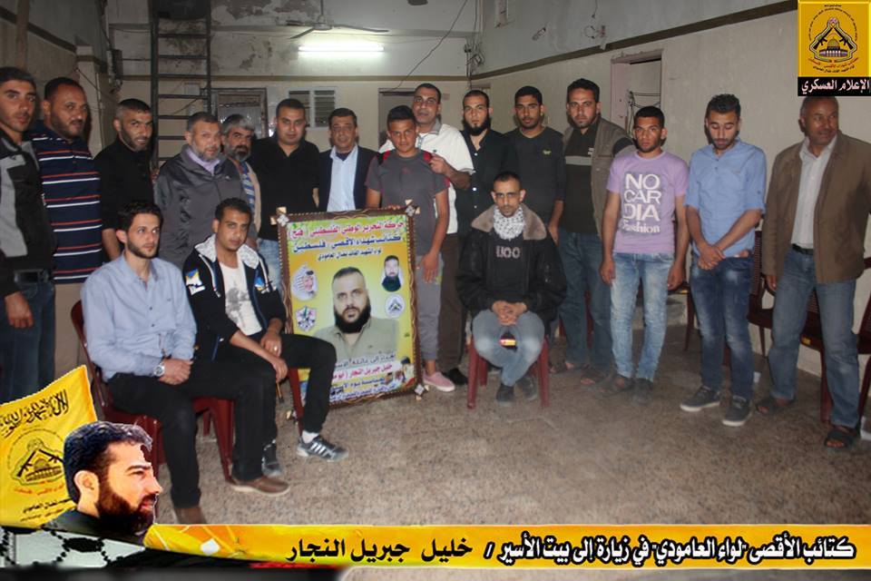 أسرانا يا تاج الفَخَار و يا فخَر الأمة ، يا من قهرتم العدو بصمودكم ويا من ضحيتم بكل ما تملكون وأفنيتم زهرة شبابكم ، يا أمجاد أمتنا و يا رمز كرامتنا و يا من أسقيتمونا كأس العزة ، أسرانا نرفع هاماتنا أمام ثباتكم ، لا ولن ننساكم وعهدنا تحريركم ولن يطول الليل فالفجر قريب ، ولأنهم الأسود في عرينهم والشامخون في زنازين العدو فقد توجه وفد من كتائب شهداء الأقصى - فلسطين (لواء الشهيد القائد / نضال العامودي) بزيارة لبيت الأسير : خليل جبريل النجار.