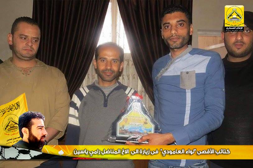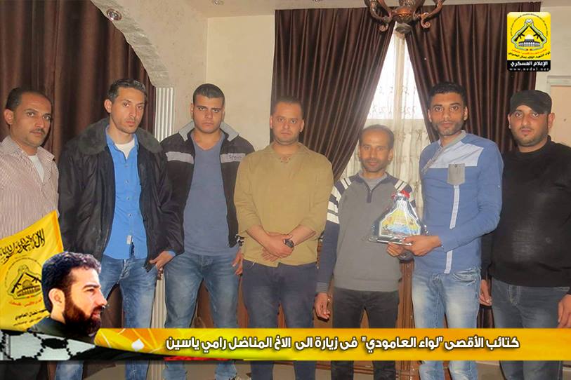 وتقدم الأخ : أبو محمد، في كلمة الكتائب بالتحية للأخ المناضل رامي ياسين، مؤكداً على الدور الريادي له في خدمة وطنه وحركته الرائدة فتح ، من جهته عبر الأخ رامي، عن عظيم شكره للوفد الزائر، مؤكداً أن كتائب الأقصى "لواء العامودي" كانت ولا زالت في الصدارة وفي طليعة العمل المقاوم، متحدثاً عن عطاء لواء العامودي لحركة فتح في كافة الميادين، وفي نهاية اللقاء تسلم الأخ درع الكتائب.
