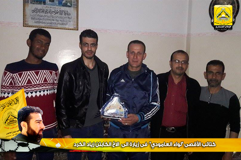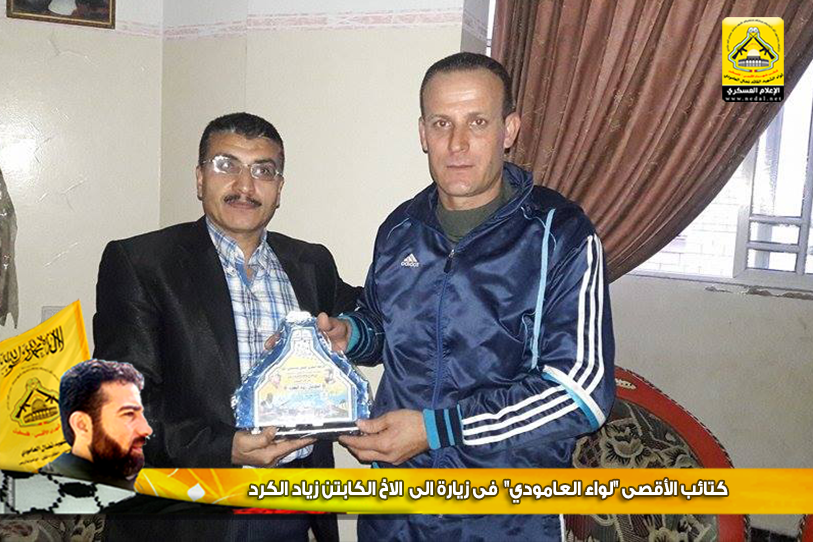 وتقدم الأخ : أبو محمد، في كلمة الكتائب بالتحية للأخ الكابتن زياد الكردي، مؤكداً على الدور الريادي له في خدمة وطنه وحركته الرائدة فتح، من جهته عبر الأخ زياد عن عظيم شكره للوفد الزائر، مؤكداً أن كتائب الأقصى "لواء العامودي" كانت ولا زالت في الصدارة وفي طليعة العمل المقاوم، وفي نهاية اللقاء تسلم الأخ درع الكتائب.