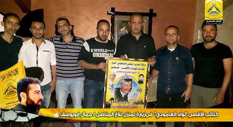 وتقدم الأخ : أبوابراهيم، في كلمة الكتائب بالتحية للأخ المناضل جمال، مؤكداً على الدور الريادي له في خدمة وطنه وحركته الرائدة فتح ، من جهته عبر الأخ أبوعماد، عن عظيم شكره للوفد الزائر، مؤكداً أن كتائب الأقصى "لواء العامودي" كانت ولا زالت في الصدارة وفي طليعة العمل المقاوم، متحدثاً عن عطاء لواء العامودي لحركة فتح في كافة الميادين، وفي نهاية اللقاء تسلم صورة الكتائب.