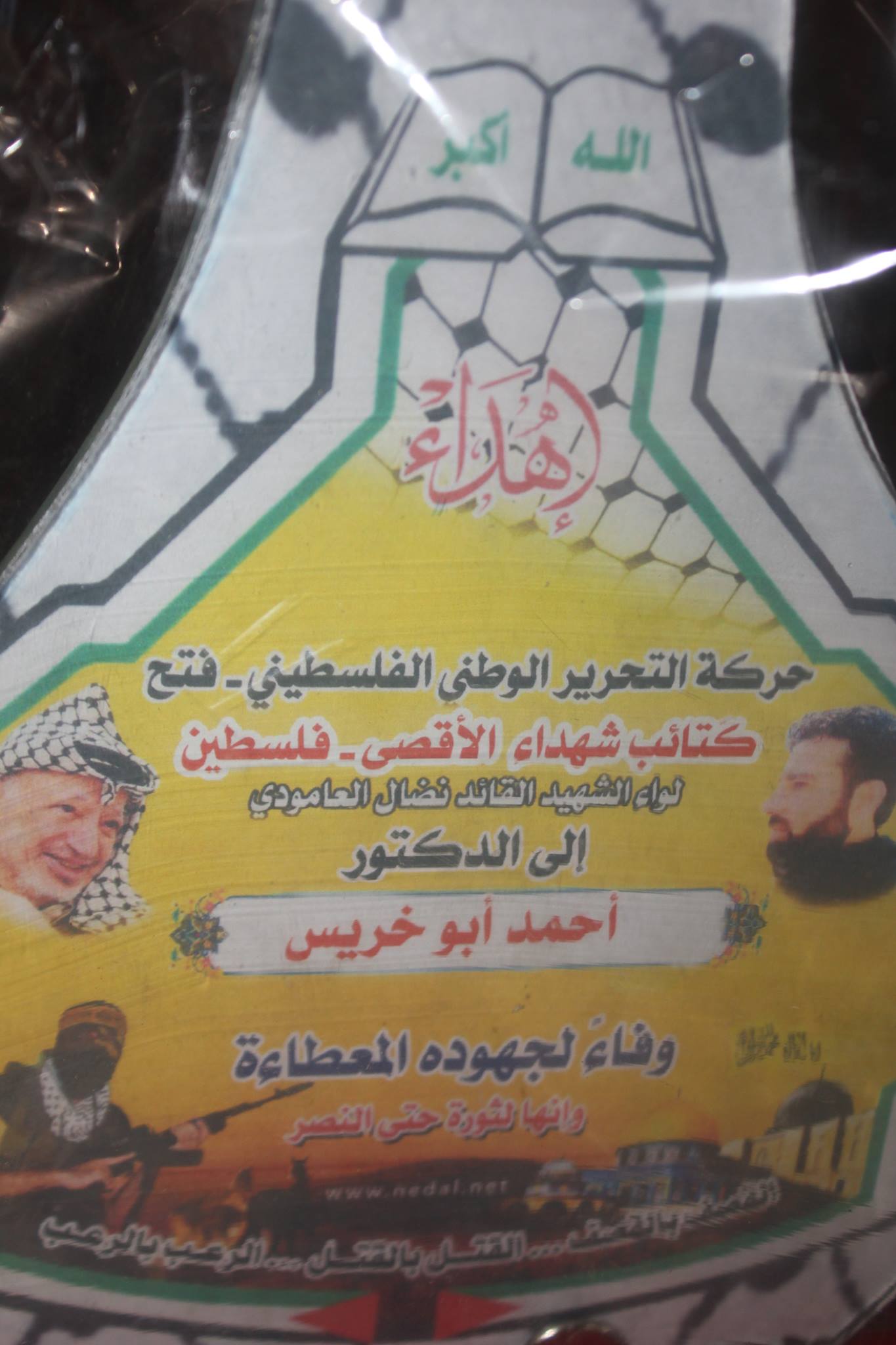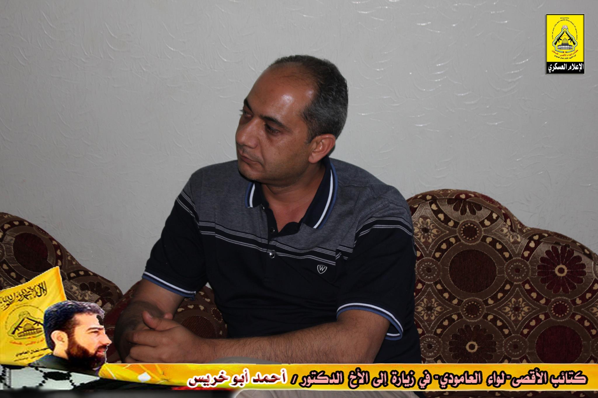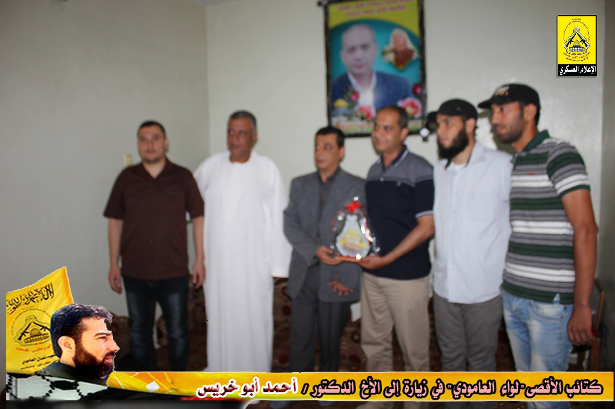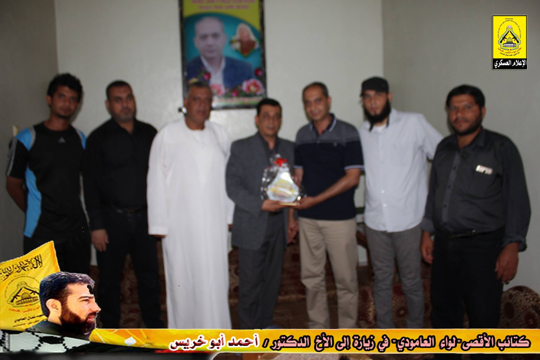 وتقدم الأخ : أبو عمر، في كلمة الكتائب بالتحية للأخ المناضل أحمد أبو خريس، مؤكداً على الدور الريادي له في خدمة وطنه وحركته الرائدة فتح ، من جهته عبر الأخ أحمد، عن عظيم شكره للوفد الزائر، مؤكداً أن كتائب الأقصى "لواء العامودي" كانت ولا زالت في الصدارة وفي طليعة العمل المقاوم، متحدثاً عن عطاء لواء العامودي لحركة فتح في كافة الميادين، وفي نهاية اللقاء تسلم الأخ درع الكتائب.