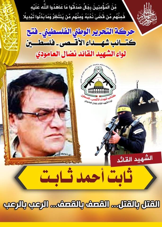 فإننا اليوم في كتائب شهداء الأقصى – فلسطين لواء الشهيد القائد " نضال العامودي"، نحُيى ذكرى إستشهاد قائد فلسطيني كبير ترجم إنتماءه لفلسطين ولقضيته من خلال مسيرة نضالية طويلة تُوجَ فصولها الأخيرة بالشهادة، مجددين العهد والقسم لروحه الطاهرة بأن نمضى قُدماً على الطريق النضالي الذي مضى وقضى عليه شهيد القائد المؤسس " ثابت أحمد ثابت "وقافلة الشهداء الأبطال .