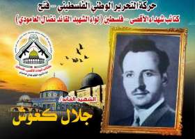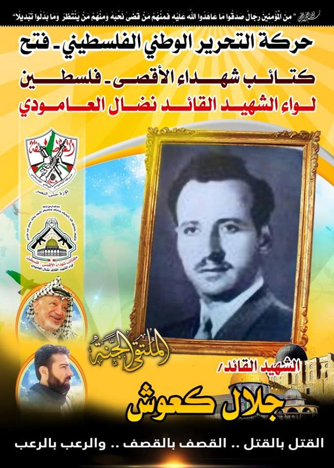 فإننا اليوم في كتائب شهداء الأقصى – فلسطين لواء الشهيد القائد " نضال العامودي "، نحُيى ذكرى إستشهاد قائد فلسطيني كبير ترجم إنتماءه لفلسطين ولقضيته من خلال مسيرة نضالية طويلة تُوجَ فصولها الأخيرة بالشهادة، مجددين العهد والقسم لروحه الطاهرة بأن نمضى قُدماً على الطريق النضالي الذي مضى وقضى عليه الشهيد القائد "جلال كعوش" وقافلة الشهداء الأبطال .