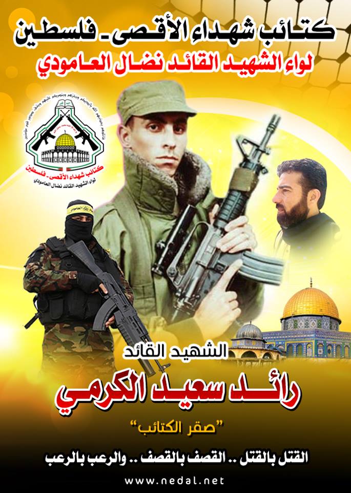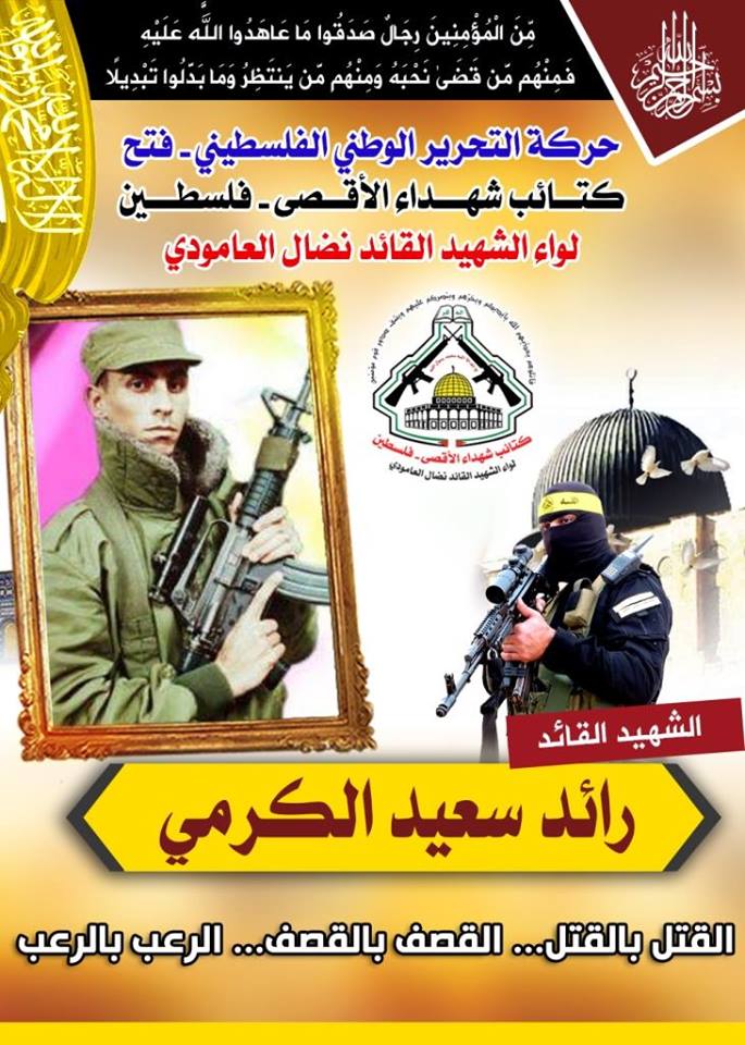 فإننا اليوم في كتائب شهداء الأقصى – فلسطين لواء الشهيد القائد " نضال العامودي"، نحُيى ذكرى إستشهاد قائد فلسطيني كبير ترجم إنتماءه لفلسطين ولقضيته من خلال مسيرة نضالية طويلة تُوجَ فصولها الأخيرة بالشهادة، مجددين العهد والقسم مع الله بأن نمضى قُدماً على الطريق النضالي الذي مضى وقضى عليه شهيدنا القائد رائد الكرمى وقافلة شهداء فلسطين الأبطال.