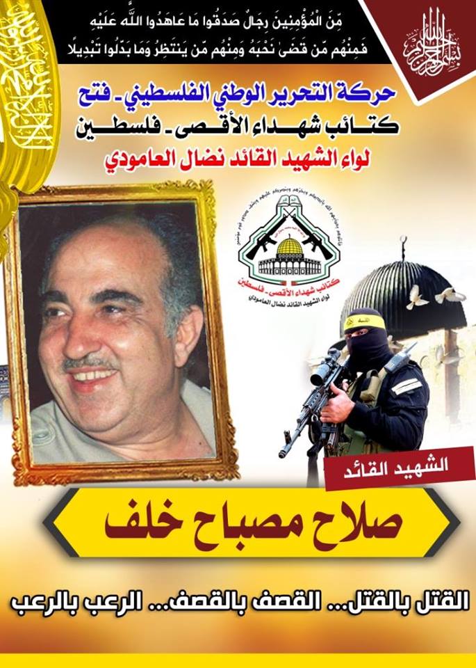فإننا اليوم في كتائب شهداء الأقصى – فلسطين لواء الشهيد القائد " نضال العامودى"، نحُيى ذكرى إستشهاد قائد فلسطيني كبير ترجم إنتماءه لفلسطين ولقضيته من خلال مسيرة نضالية طويلة تُوجَ فصولها الأخيرة بالشهادة، مجددين العهد والقسم لروحه الطاهرة بأن نمضى قُدماً على الطريق النضالي الذي مضى وقضى عليه شهيدنا القائد المؤسس " صلاح مصباح خلف " وقافلة الشهداء الأبطال .
