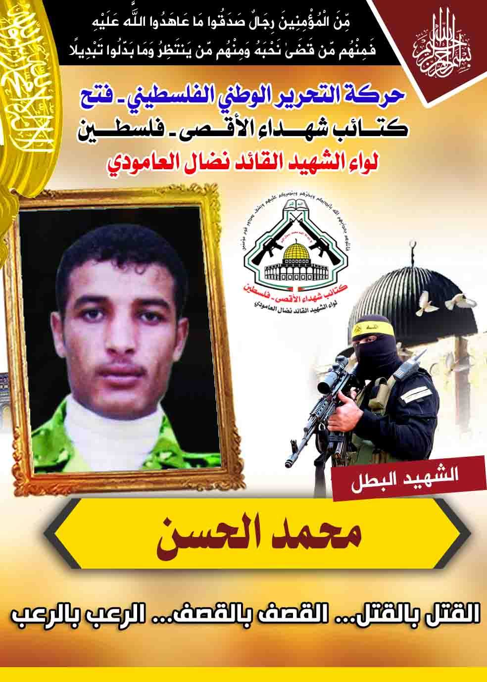 فإننا اليوم فى كتائب شهداء الأقصى – فلسطين لواء الشهيد القائد " نضال العامودي"، نُحيى ذكرى استشهاد " محمد الحسن " ،مجددين العهد والبيعة مع الله عزوجل على أن نبقى الأوفياء لدماء الشهداء الأبطال الذين ضحو بدمائهم الذكية لتحرير أرضنا الفلسطينية المحتلة.
