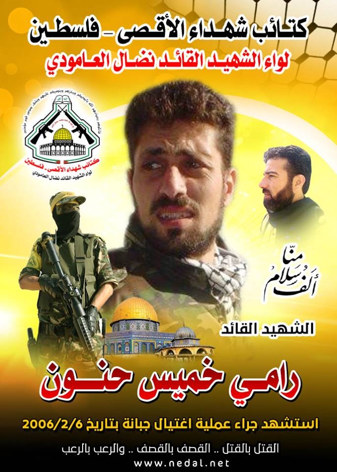 فإننا اليوم في كتائب شهداء الأقصى - فلسطين لواء الشهيد القائد " نضال العامودي" ننحني إجلالاً وإكباراً لروح شهيدنا القائد المجاهد، رامى حنون ، مجددين العهد والقسم مع الله ثم لدمائهم الذكية، بان نمضي قدماً على طريقهم النضالي الذي مضى وقضى عليه خيرة أبناء شعبنا من الشهداء العظام .