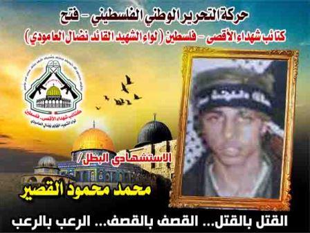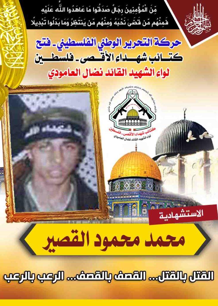 فإننا اليوم فى كتائب شهداء الأقصى - فلسطين لواء الشهيد القائد " نضال العامودي" نحُيى ذكرى إستشهاد  الشهيد المجاهد " محمد محمود القصير" معاهدين الله عزوجل وأروح شهدائنا جميعا،وروح شهيدنا المجاهد بأن نمضي قدماً على طريقه الجهادي الذي قضى عليه مدافعاً عن أرضه وشعبه ووطنه الذي يفتقده اليوم بهذه السطور القليلة أمام تضحياته البطولية.