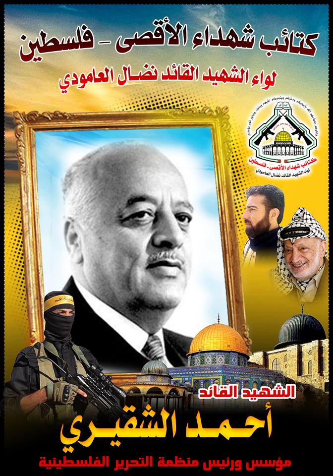 فإننا اليوم في كتائب شهداء الأقصى – فلسطين لواء الشهيد القائد " نضال العامودي"، نحُيى ذكرى إستشهاد قائد فلسطيني كبير ترجم إنتماءه لفلسطين ولقضيته من خلال مسيرة نضالية طويلة تُوجَ فصولها الأخيرة بالشهادة، مجددين العهد والقسم مع الله بأن نمضى قُدماً على الطريق النضالي الذي مضى وقضى عليه الشهيد القائد " أحمد الشقيري"وقافلة الشهداء فلسطين الأبطال .