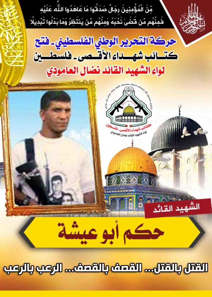 فإننا اليوم فى كتائب شهداء الأقصى – فلسطين لواء الشهيد القائد " نضال العامودي"، نحُيى ذكرى إستشهاد القائد " حكم أبو عيشة "، مجددين العهد والقسم مع الله عزوجل ولروحه الطاهرة، بأن نمضى قدماً على طريق النضال الذي مضى وقضى عليه شهيدنا المغوار.