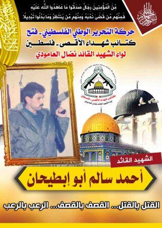 تحل علينا اليوم الثامن والعشرون من شهر مارس الذكرى السنوية لإستشهاد " أحمد سالم سليمان أبو إبطيحان " أحد قادة " صقور الفتح " الذراع العسكرى لحركة التحرير الوطنى الفلسطينى " فتح " فى قطاع غزة ،وأحد الشهداء الستة الذين إغتالتهم القوات الصهيونية الخاصة في مخيم التحدى والصمود والكبرياء " مخيم جباليا " التي قدمت نموذجاً نضالياً يحتذى به من قبل كافة المدن والأحياء الفلسطينية التي تشهد بصلابة هذا المخيم الفلسطيني العريق وعلى عزيمة رجاله الأوفياء.
