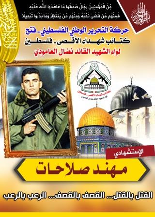 فإننا اليوم في كتائب شهداء الأقصى – فلسطين لواء الشهيد القائد " نضال العامودي"، نحيي ذكرى إستشهاد المجاهد الإستشهادى " مهند صلاحات " وإذ ننحنى إجلالاً وإكباراً لروح شهيدنا المجاهد في ذكرى إستشهاده ونعاهد الله أن نبقى الأوفياء لدمائه الطاهرة التي روت أرض القدس المحتلة.