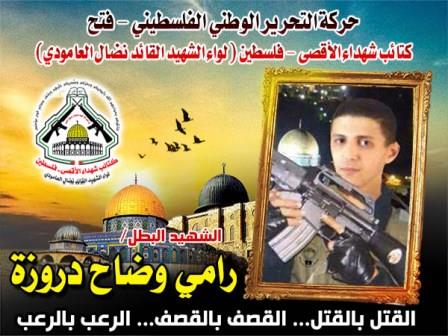 فإننا اليوم في كتائب شهداء الأقصى – فلسطين لواء الشهيد القائد " نضال العامودي"، نحيي ذكرى إستشهاد المجاهد القائد " رامى دروزة " وإذ ننحنى إجلالاً وإكباراً لروح شهيدنا المجاهد في ذكرى إستشهاده ونعاهد الله أن نبقى الأوفياء لدمائه الطاهرة التي روت أرض فلسطين .