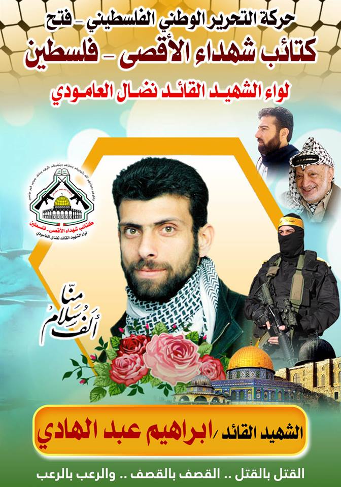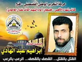 فإننا اليوم فى كتائب شهداء الأقصى - فلسطين لواء الشهيد القائد " نضال العامودي" لن ندع هذه الذكرى العطرة أن تمر مرور الكرام دون أن نضع لمسات من الوفاء لروح الشهيد القائد " إبراهيم عبدالهادي " الذي نحيي اليوم ذكرى إستشهاده ولنؤكد بأننا لن ننساه وسيبقى متربعاً في قلوبنا حتى نلقاه،شهداء على ذات الدرب بإذن الله تعالى .