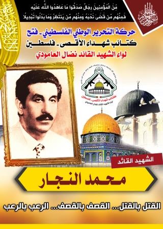 فإننا اليوم في كتائب شهداء الأقصى – فلسطين لواء الشهيد القائد " نضال العامودى"، نحُيى ذكرى إستشهاد قائد فلسطيني كبير ترجم إنتماءه لفلسطين ولقضيته من خلال مسيرة نضالية طويلة تُوجَ فصولها الأخيرة بالشهادة، مجددين العهد والقسم مع الله بأن نمضى قُدماً على الطريق النضالي الذي مضى وقضى عليه الشهيد القائد محمد يوسف النجار وقافلة الشهداء فلسطين الأبطال .