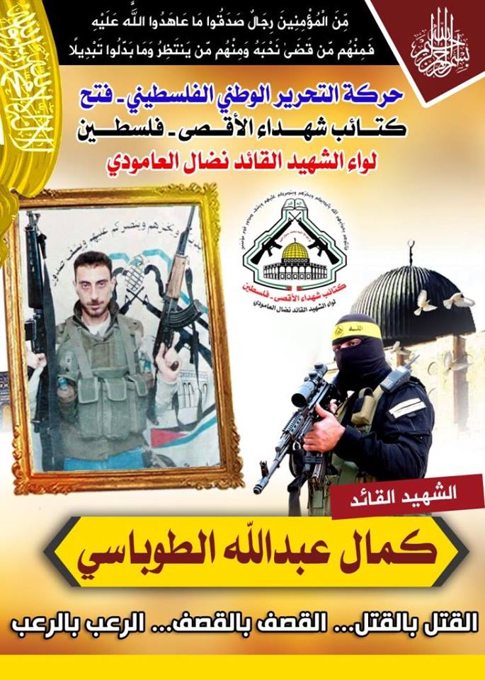 فإننا اليوم في كتائب شهداء الأقصى – فلسطين لواء الشهيد القائد " نضال العامودي"، نحيي ذكرى إستشهاد المجاهد القائد " كمال الطوباسى " ورفاقة وإذ ننحنى إجلالاً وإكباراً لروح شهدائنا القادة في ذكرى إستشهادهم ونعاهد الله أن نبقى الأوفياء لدمائه الطاهرة التي روت أرض فلسطين .