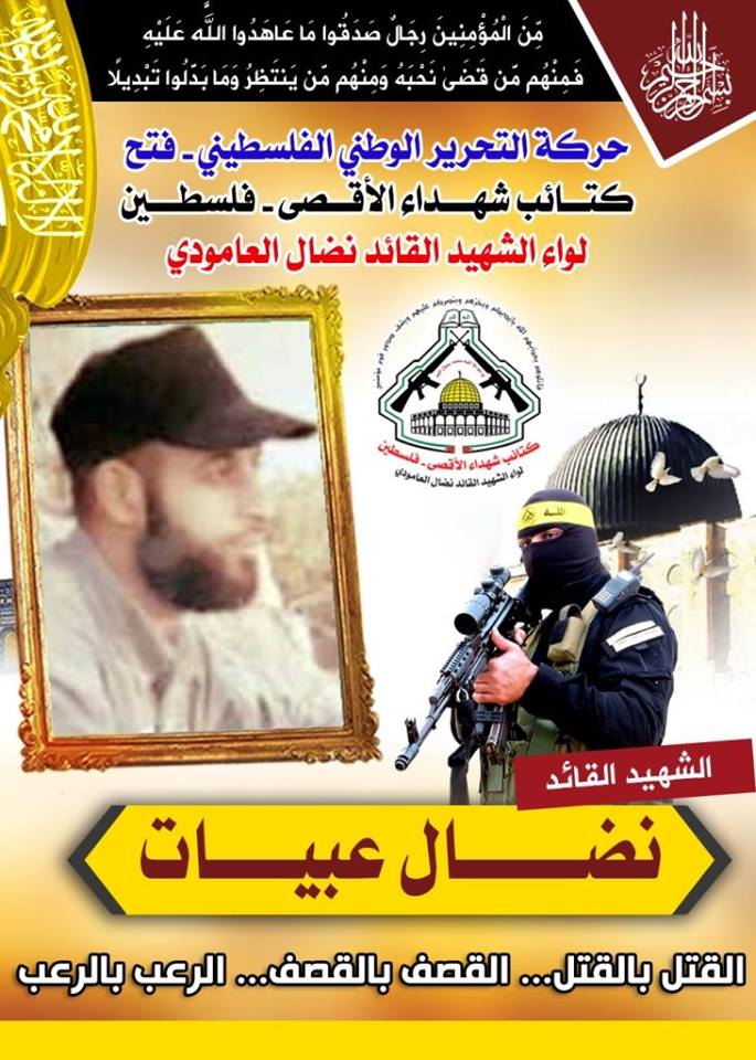 فإننا اليوم في كتائب شهداء الأقصى – فلسطين لواء الشهيد القائد " نضال العامودي"،نبرق بتحية وفاء لروح الشهيد القائد، نضال عبيات في ذكرى إستشهاده ونعاهد روحه الطاهرة بمواصلة طريقه النضالي الذي مضى وقضى عليه شهيداً مدافعاً عن كرمة الأمة وعروبتها .