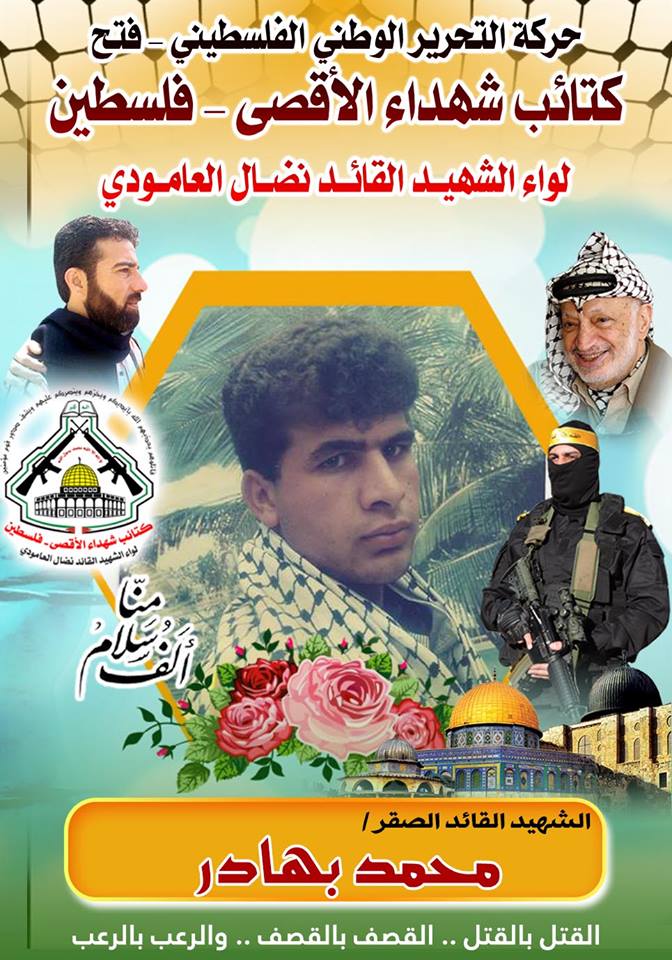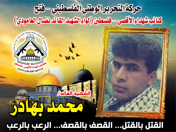 فإننا اليوم في كتائب شهداء الأقصى - فلسطين لواء الشهيد القائد " نضال العامودي"، ننحني إجلالاً وإكباراً لروح شهيدنا القائد، " محمد بهادر" الذي إستطاع برفقة إخوة البندقية بإدخال الرعب إلي قلوب الصهاينة بالداخل المحتل.
