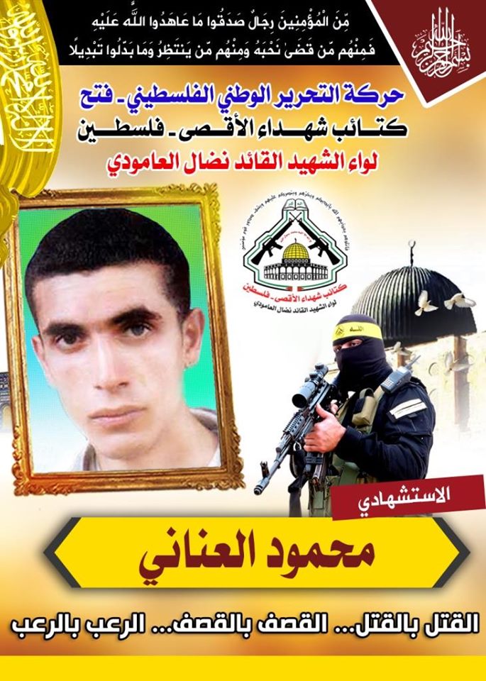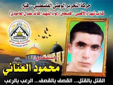 فإننا اليوم في كتائب شهداء الأقصى - فلسطين لواء الشهيد القائد " نضال العامودي"،، نبرق بتحية إجلال وإكبار لروح شهيدنا المجاهد ” محمود العنانى " في ذكرى إستشهاده مجددين العهد والبيعة مع الله بأن نمضي قدماً على طريقه الجهادى الذي إختتم فصوله الأخيرة بالشهادة في سبيل الله مدافعاً عن أرض فلسطين المباركة وعن كرامة أمتنا العربية برمتها .