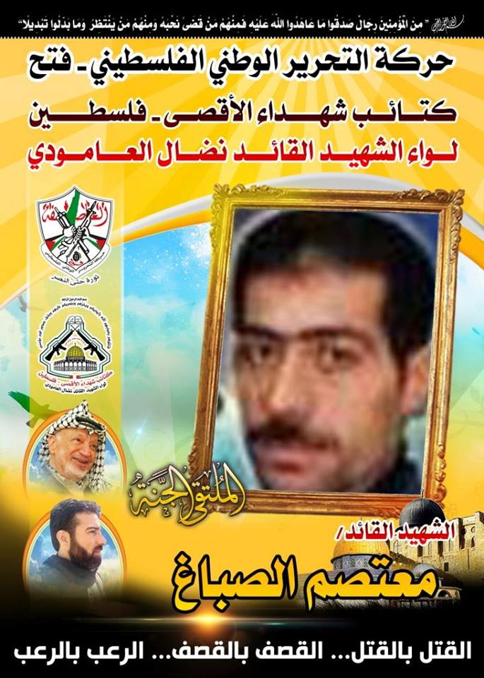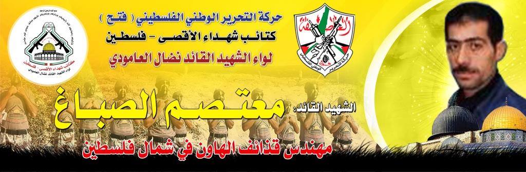فإننا اليوم في كتائب شهداء الأقصى - فلسطين لواء الشهيد القائد " نضال العامودي"،ننحني ذكرى إستشهاد شهيدنا القائد،" معتصم الصباغ "،الذي إستطاع إدخال عنصر الرعب إلي قلوب مستوطني المغتصبات الصهيونية بعد نجاحه في صناعة قذائف الهاون محلية الصنع،والشهيد علام جالودى .