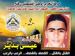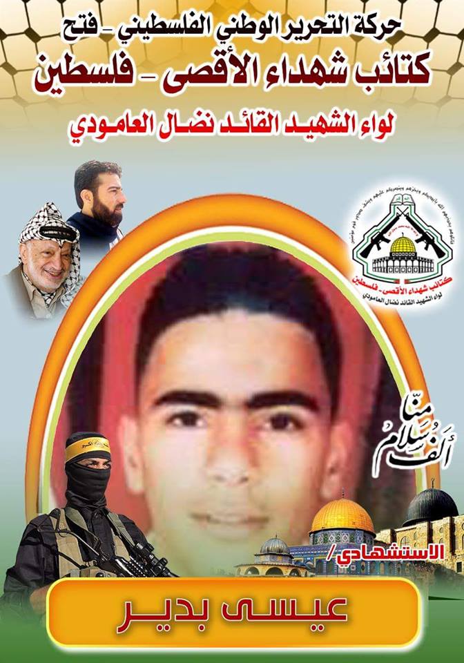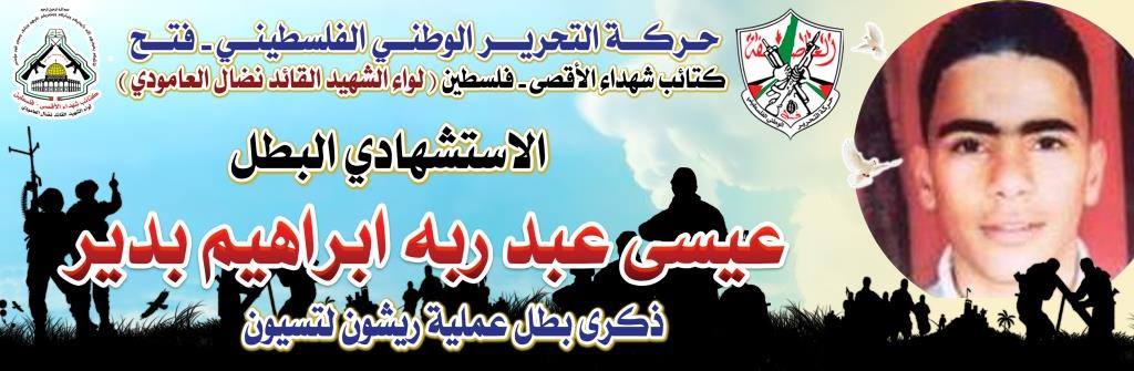 فإننا اليوم في كتائب شهداء الأقصى – فلسطين لــواء الشهيد القائد " نضال العامودي"، ننحني إجلالاً وإكباراً لروح الإستشهادي المجاهد، عيسى عبد ربه إبراهيم بدير، الذي قدم روحه الطاهرة تقرباً إلي الله عز وجل وشكل بعمليته البطولية صفعة قوية للإحتلال ومؤسسته العسكرية وأثبت بأن المقامة الفلسطينية لا تقتل من أجل القتل وإنما هي تحمل أهداف سامية تتمثل بالبحث عن كرامة شعب يقبع حتى يومنا هذا تحت الإحتلال المجرم .