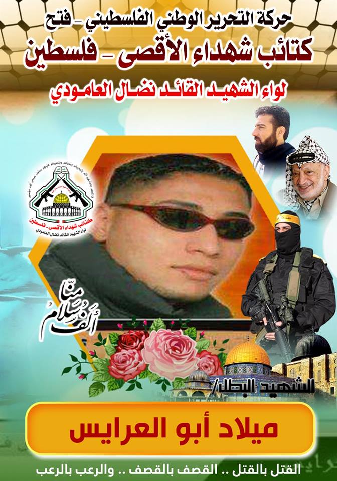 فإننا اليوم في كتائب شهداء الأقصى - فلسطين لواء الشهيد القائد " نضال العامودي"، نحيي ذكرى إستشهاد البطل المقدام والفارس الهمام،"ميلاد أبو العريس"،مجددين العهد والقسم مع الله بأن نبقى الأوفياء لدماء الشهداء التي روت ثرى فلسطين .