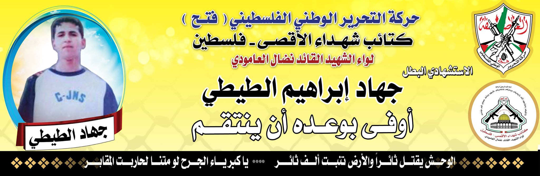 فإننا اليوم في كتائب شهداء الأقصى – فلسطين لواء الشهيد القائد " نضال العامودي"،نحيي ذكرى إستشهاد المجاهد الإستشهادى " جهاد الطيطى" وإذ ننحنى إجلالاً وإكباراً لروح شهيدنا المجاهد في ذكرى إستشهاده ونعاهد الله أن نبقى الأوفياء لدمائه الطاهرة التي روت أرض القدس المحتلة .