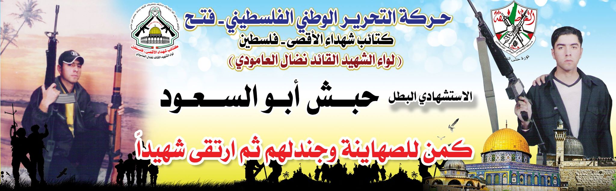 فإننا اليوم فى كتائب شهداء الأقصى - فلسطين لواء الشهيد القائد " نضال العامودي"،نحُيى ذكرى إستشهاد الشهيد المجاهد " حبش أبو السعود " معاهدين الله عزوجل وأروح شهدائنا جميعا،وروح شهيدنا المجاهد بأن نمضي قدماً على طريقه الجهادي الذي قضى عليه مدافعاً عن أرضه وشعبه ووطنه الذي يفتقده اليوم بهذه السطور القليلة أمام تضحياته البطولية .