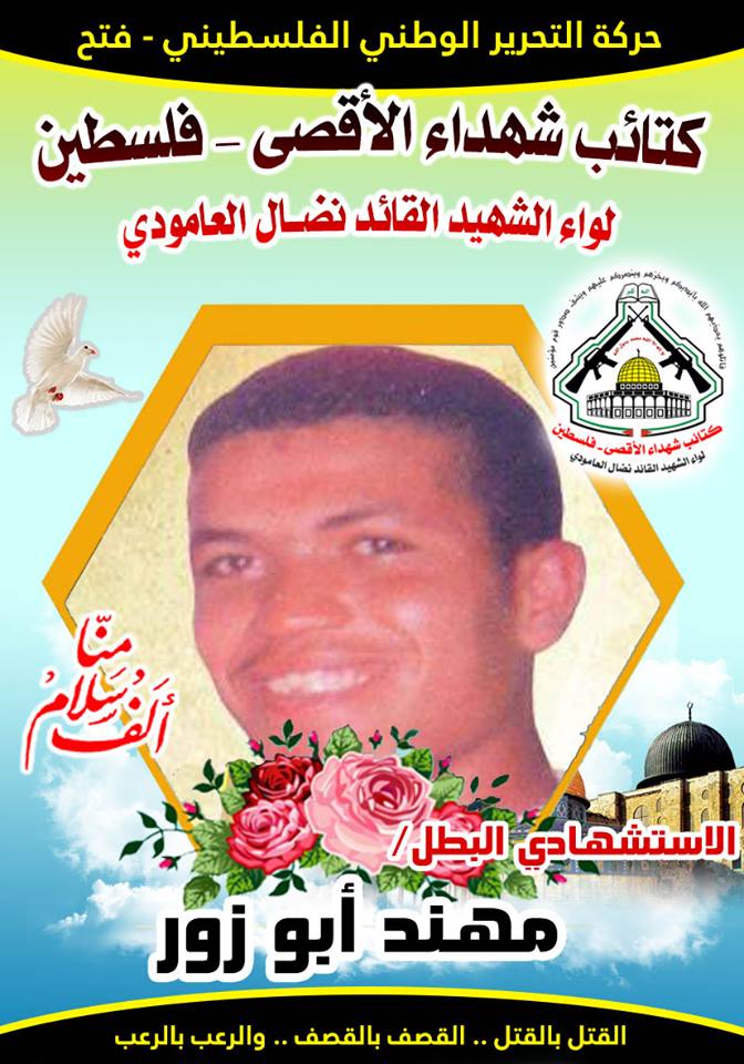 فإننا اليوم في كتائب شهداء الأقصى – فلسطين لواء الشهيد القائد " نضال العامودي"، لن ندع هذه الذكرى العطرة أن تمر مرور الكرام دون أن نضع لمسات من الوفاء لروح الإستشهادي البطل: مهند ابو زور الذي نحيي اليوم ذكراه ونؤكد بأننا لن ننساه وسيبقى متربعاً في قلوبنا حتى نلقاة،شهداء على ذات الدرب بإذن الله تعالى .