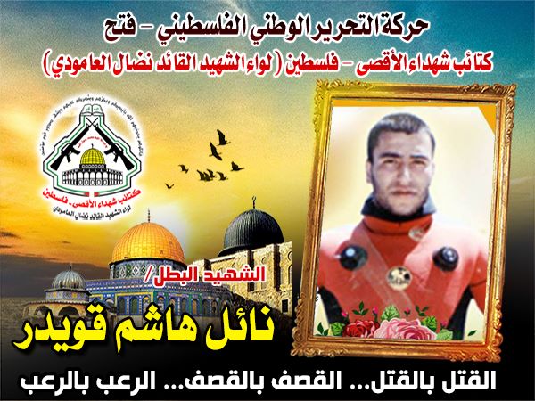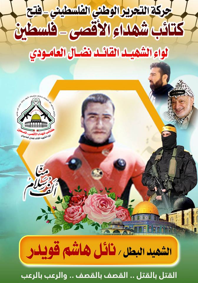 فإننا اليوم في كتائب شهداء الأقصى - فلسطين لــواء الشهيد القائد " نضال العامودي "،نحيي ذكرى إستشهاد قائد وحدة الكوماندوزالبحرى، الشهيد المجاهد " نائل قويدر " وننحني إجلالاً وإكباراً لروحه الطاهرة في ذكرى إستشهاده التي ستبقى خالدة في قلوب كل الشرفاء من أبناء شعبه المجاهد.